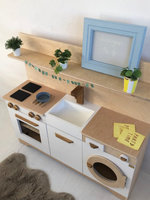 Drewniana mini kuchnia dla dzieci z lodówką, piekarnikiem i zmywarką handmade
