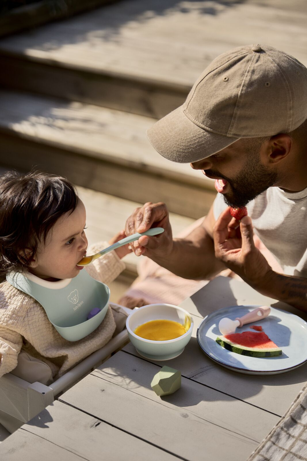 Solidna miseczka dla niemowląt, którą można łatwo trzymać podczas karmienia. Łyżka do karmienia z praktyczną długą rączką. Mały śliniaczek z wyjątkowo miękkim dekoltem.