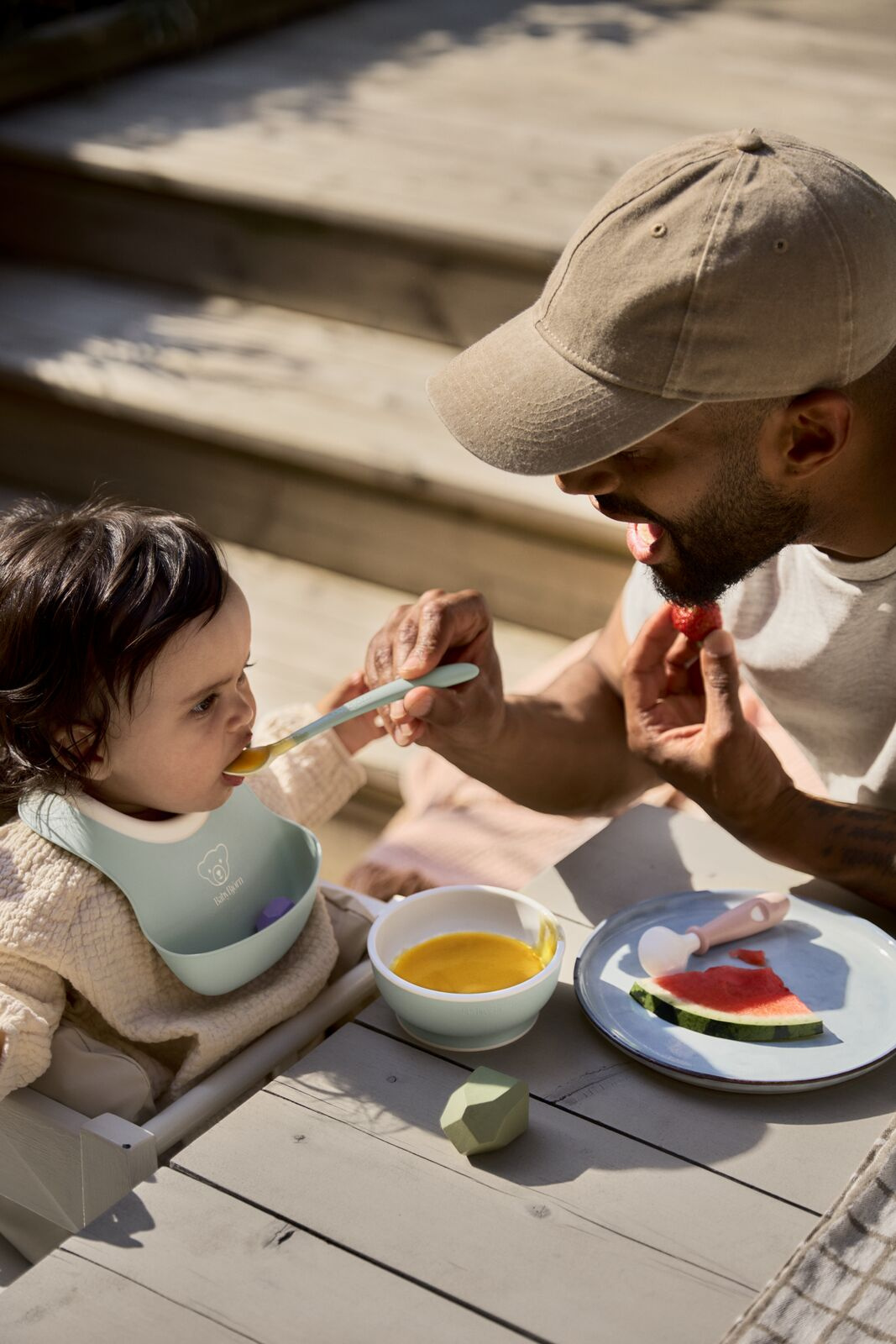 Miseczka oraz łyżeczka do karmienia mogą być używane od około szóstego miesiąca życia. Śliniaczek dla niemowląt jest już od około czwartego miesiąca życia.