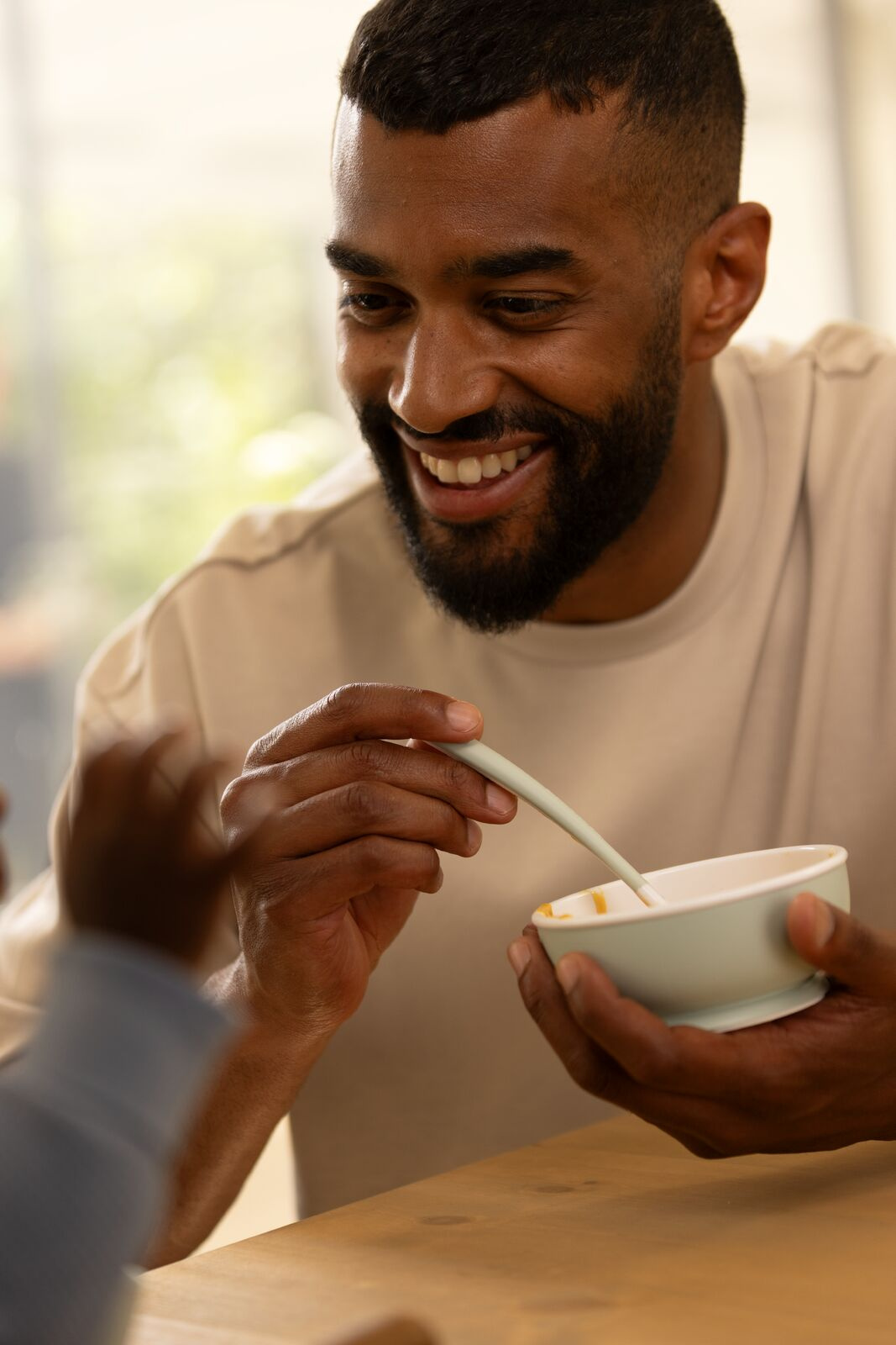 Zestaw jest idealny dla małych dzieci, które dopiero zaczynają smakować pokarmy stałe, ale są nadal karmione przez rodzica. Zawiera wszystko, co niezbędne do wprowadzenia dziecka do pokarmów stałych: solidną miskę, którą można łatwo trzymać w jednej ręce (dzięki czemu możesz karmić drugą), łyżkę do karmienia z długim uchwytem i wygodny śliniaczek, który pomoże złapać każdy bałagan.