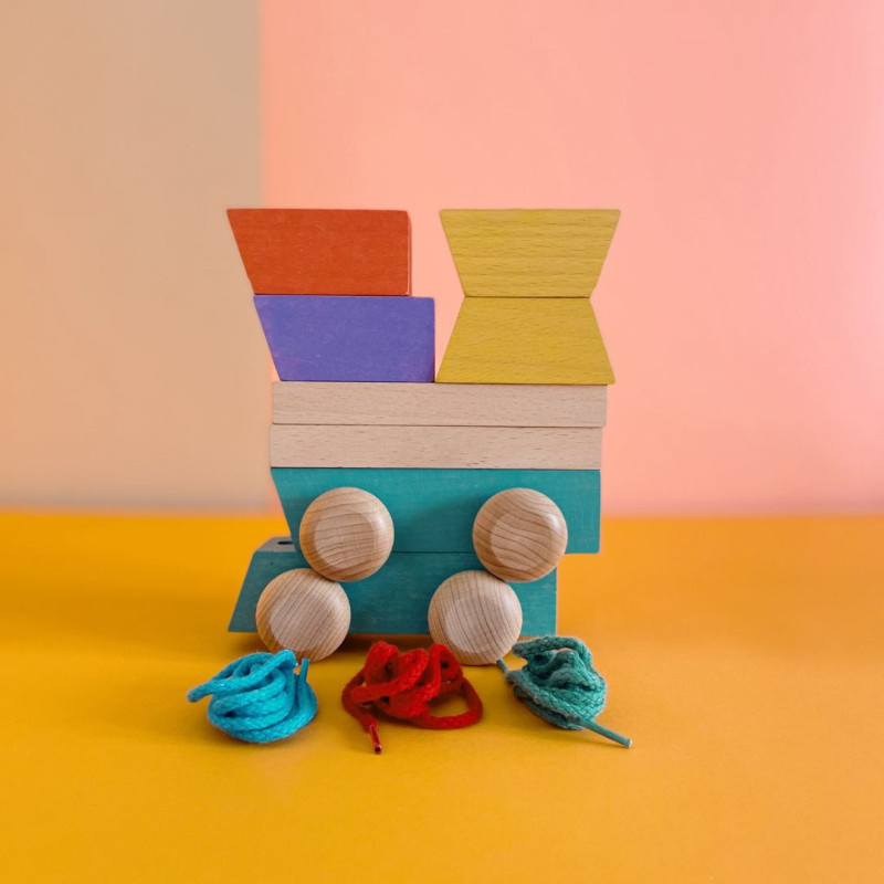 Klocki zazwyczaj kojarzą się z architekturą i budownictwem, z czymś stabilnym i trwałym. Ale tym razem postanowiliśmy troche je rozruszać i dać się ponieść wyobraźni! Ten zestaw pozwala dzieciom budować własne pojazdy, których szkieletem są sznurki. To dzięki nim całość trzyma się razem. Dodatkowo nawlekając klocki na sznurówki, dzieci ćwiczą motorykę mała oraz koordynację wzrokowo-ruchową.