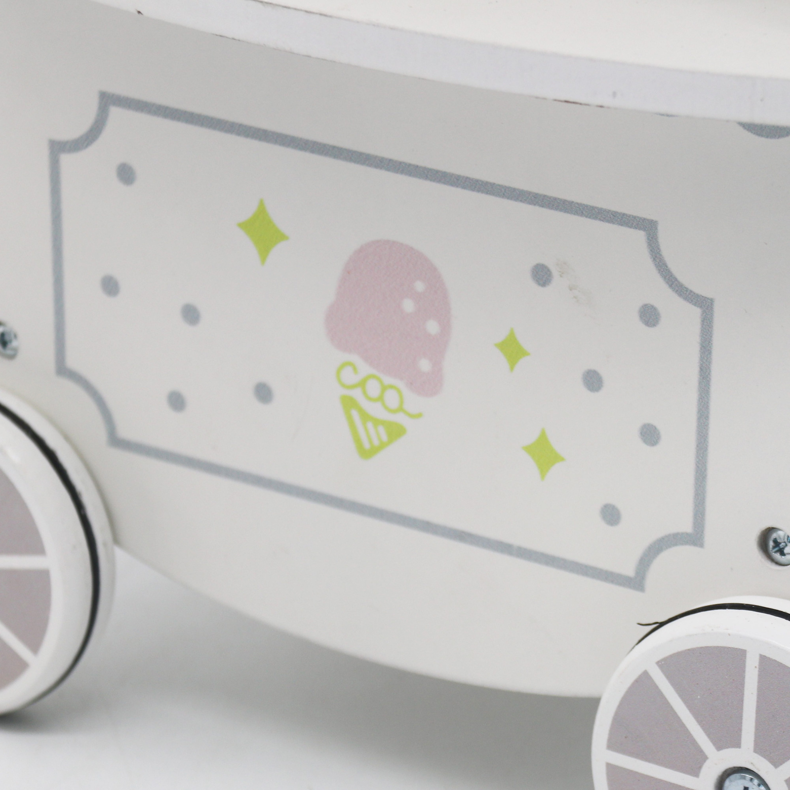 Drewniana lodziarnia na kółkach z akcesoriami, kolor biały