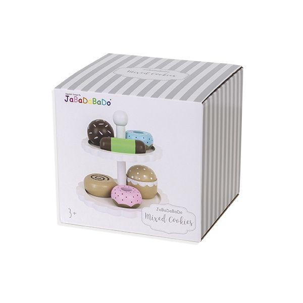 Piękna drewniana dwupoziomowa patera marki Jabadabado z uroczymi słodkościami wygląda smakowicie! W zestawie znajduje się sześć ciasteczek każdy pięknie wykonany, w uroczej pastelowej kolorystyce, z charakterystycznymi dla tej marki kropeczkami.
