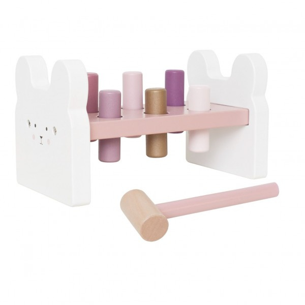 Wbijanka składa się z z podstawki zwanej ławeczką, sześciu bolców do wbijania w kolorystyce pastelowej, oraz z młotka. Te drewniane klocki z młotkiem to ulubiona zabawka zarówno dla dziewczynki, jak i chłopca - można by rzec obowiązkowa zabawka dla każdego malucha -ćwiczy sprawność manualną, kształtuje wyobraźnię przestrzenną a przede wszystkim bawi, sprawiając radość.