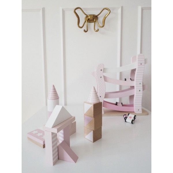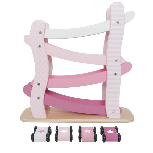 Drewniana zjeżdżalnia, pochylnia dla aut - to genialna zabawka dla małych fanek motoryzacji w nowej pastelowo- różowej kolorystyce skradnie serca dziewczynek. Ten drewniany tor samochodowy składa się z czterech połączonych pochylnie tras. Wystarczy umieścić jeden z samochodów na szczycie wieży i oglądać go jak zjeżdża w dół. W zestawie znajdują się cztery auta, można je puszczać wszystkie razem.