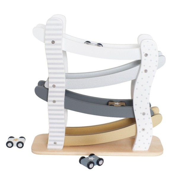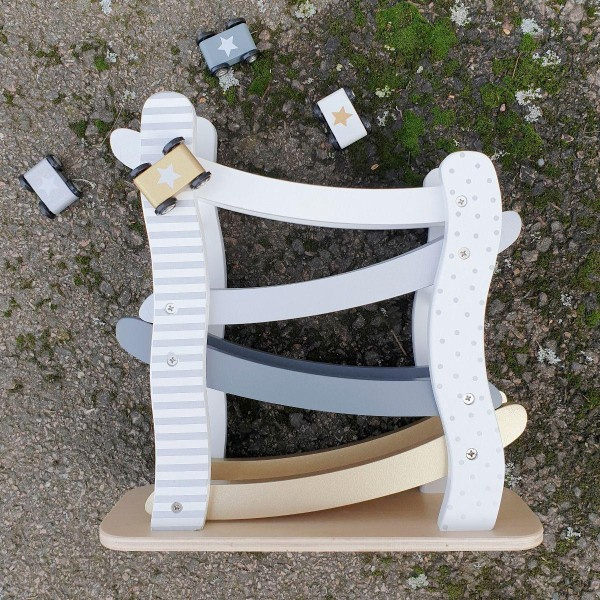 Zjeżdżalnia jest wykonana z najwyższej jakości drewna, niezwykle starannie z dbałością o każdy szczegół, dzięki swojej jasnoszarej kolorystyce z dodatkami srebrnymi i złotymi, pasuje do każdego dziecięcego wyposażenia pokoju. Samochody zjeżdżają naprawdę szybko - sprawiając radość nie tylko chłopcom - i dzieciom w każdym wieku. Obok tej zabawki nie można przejść obojętnie.