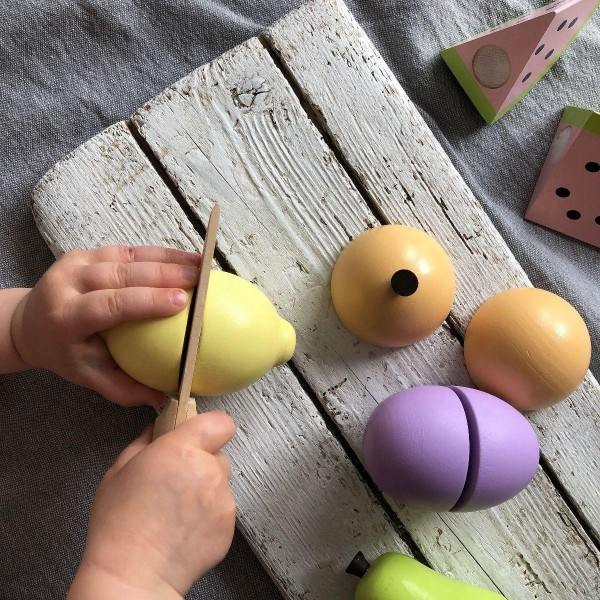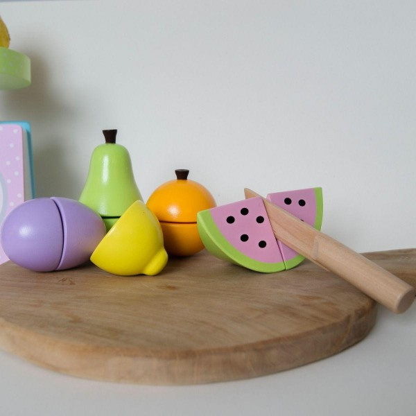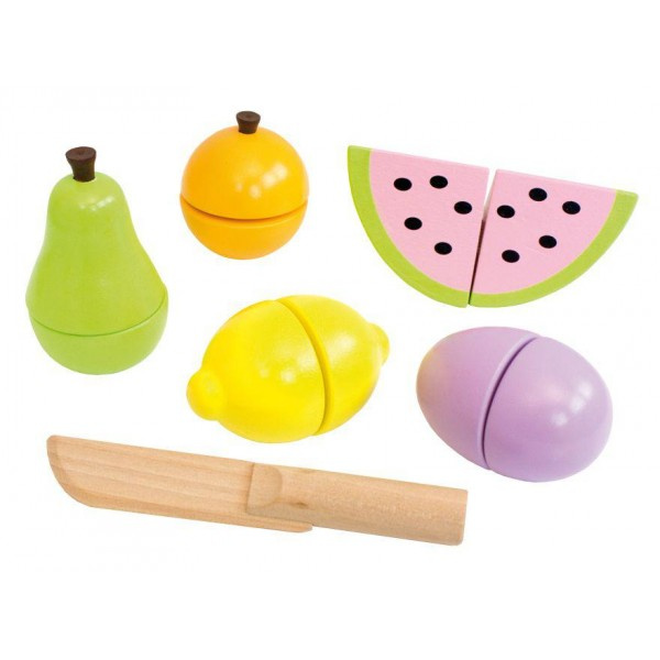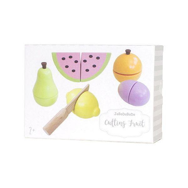 - Zestaw pięciu drewnianych owoców do krojenia marki Jabadabado wraz z drewnianym nożykiem. W zestawie: pomarańcz, truskawka, gruszka, banan i śliwka. Idealne do zabawy w gotowanie, jak również do nauki sprawnego posługiwania się sztućcami.