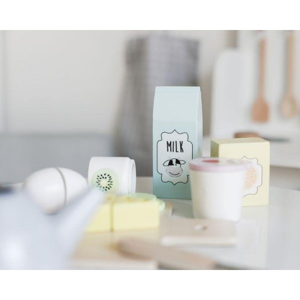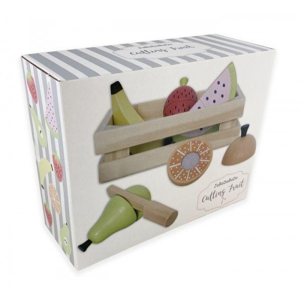 Zestaw pięciu drewnianych owoców do krojenia marki Jabadabado wraz z drewnianym nożykiem i drewnianą skrzynką do przechowywania. W zestawie: pomarańcz, truskawka, gruszka, banan i melon. Idealne do zabawy w gotowanie, jak również do nauki sprawnego posługiwania się sztućcami.