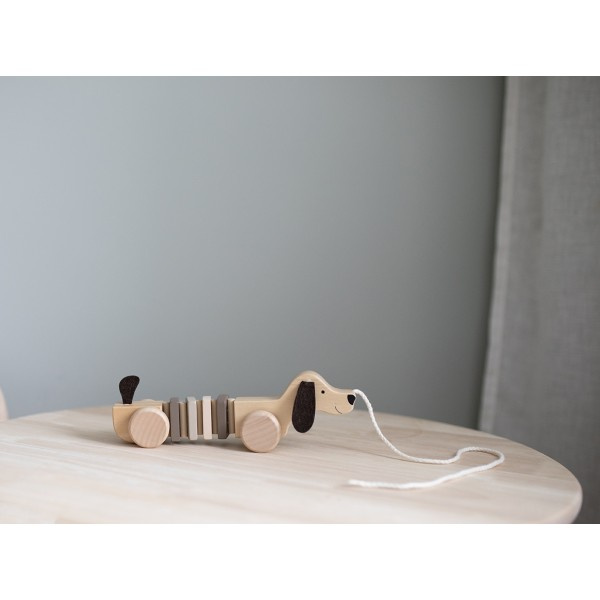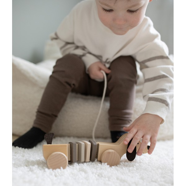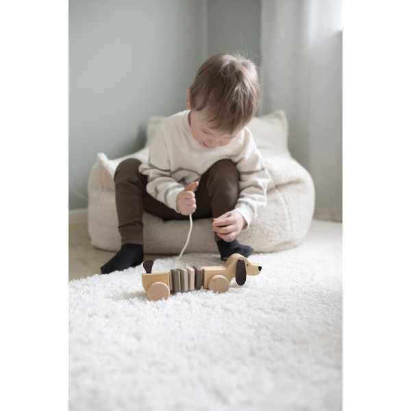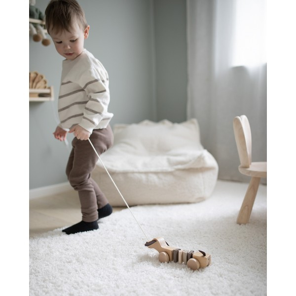 Drewniany piesek do ciągnięcia na sznurku skandynawskiej marki Jabadabado w stonowanej, naturalnej kolorystyce stanie się nieodzownym kompanem pierwszych spacerów. Idealny do stawiania pierwszych niezależnych kroków, zachęcający do aktywności ruchowej maluchów, sprzyjającej rozwojowi koordynacji. Ta klasyczna zabawka do ciągnięcia na sznurku, idealnie nadaje się na pierwsze pupila domowego. Drewniany piesek wspomaga rozwój dużej motoryki, uczy także zależności przyczyna-skutek.