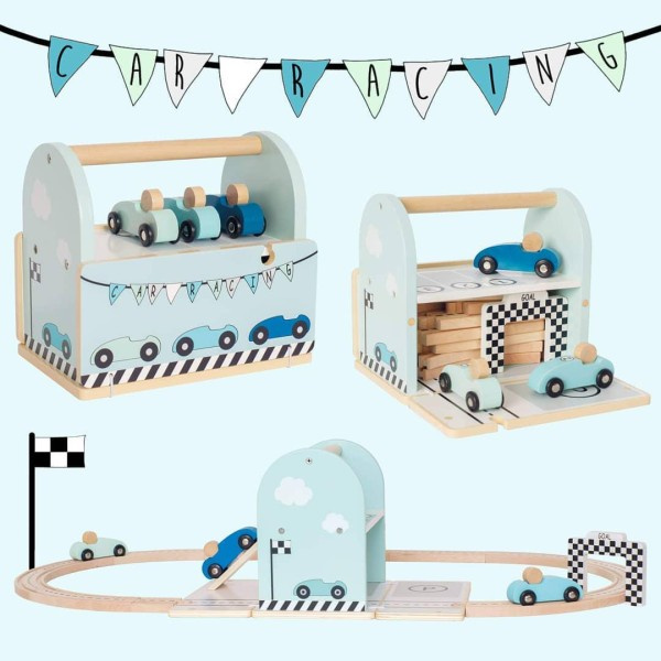 To wyścigowy zawiera trzy wyścigówki każda w innym odcieniu niebieskiego, dwanaście elementów drewnianego toru -drogi do złożenia, metę i pochylnię oraz pudełko -padok do rozpoczęcia wyścigu, który służy również jako praktyczne pudełko do przechowywania oraz przenoszenia całego zestawu.