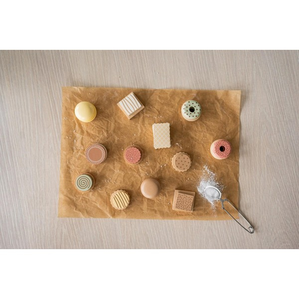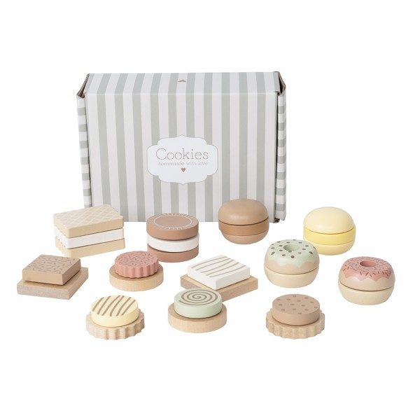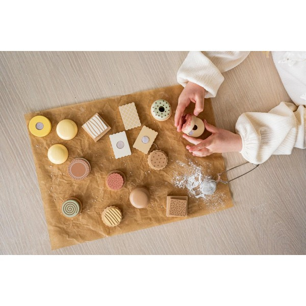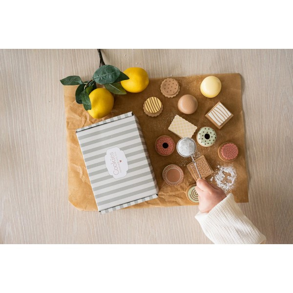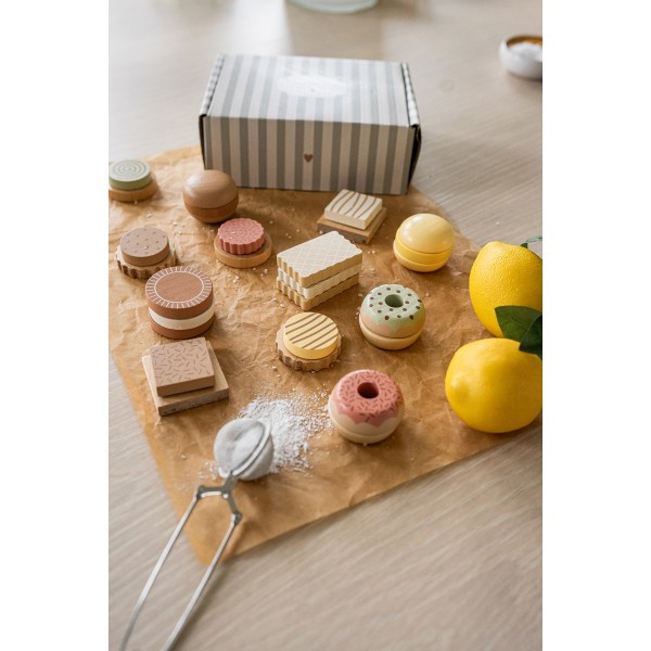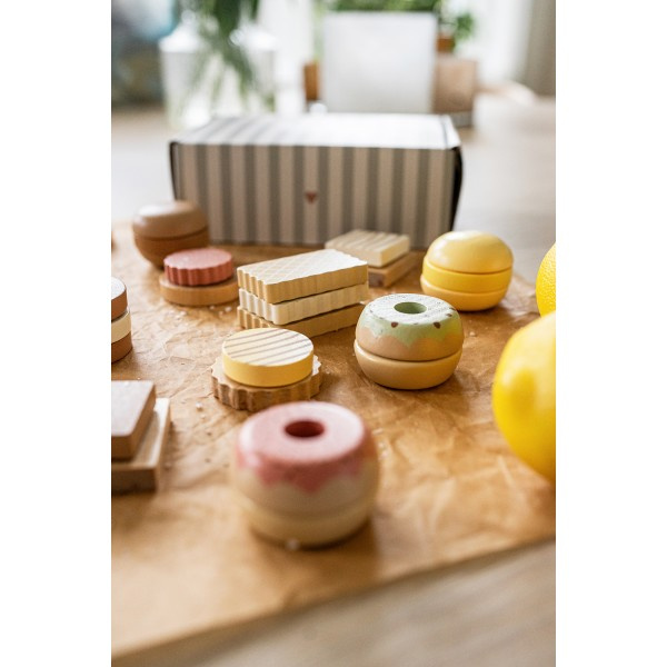 Piękny drewniany zestaw ciasteczek marki Jabadabado wygląda smakowicie! W zestawie znajduje się  dwanaście ciasteczek makaroników, każdy pięknie wykonany, w uroczej pastelowej kolorystyce. Idealna zabawka dla małych cukierników i gospodarzy, ten uroczy zestaw słodkości  będzie doskonałym uzupełnieniem dziecięcej kuchni, ale także samodzielnym zestawem do zabawy dzięki któremu Twoje dziecko przygotuje apetyczny deser dla swoich lal i misiów i niewątpliwie zaprosi na niego także Ciebie :) Wymiary: 20x 14x 7 cm Wiek: 2+ Wykonane z certyfikowanego drewna FSC. Jabadabado to szwedzka firma istniejąca na rynku od 1993 roku specjalizująca się w projektowaniu i produkcji zabawek drewnianych, elementów wyposażenia pokoi dziecięcych. Wszystkie produkty Jabadabado cechuje oryginalny design, piękna kolorystyka i niezwykle staranne wykonanie. Wszystkie zabawki marki Jabadabado stworzone są z myślą o dzieciach i pobudzają do kreatywnej zabawy.