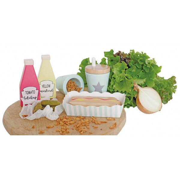 Świetny drewniany zestaw hot dog zapakowany w efektowne pudełko na wynos, idealny do kreatywnej zabawy w komponowanie posiłków oraz sklep czy restaurację. Najlepszą formą rozwoju i nauki u dzieci jest zabawa, dlatego bawiące się dzieci najlepiej chłoną wiedzę z radosnej zabawy. W zestawie : paróka, bułka do hot dogów, kubek z otwieranym wieczkiem i słomką, ketchup, musztardę, opakowanie na hot doga, oraz opakowanie na cały zestaw na wynos. Jest to z pewnością w pełni zdrowy zestaw fas-food dla dziecka:)
