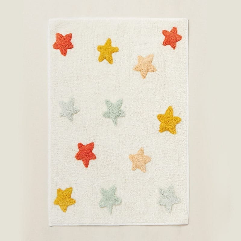 Śliczny dywan dziecięcy w gwiazdki o wymiarach 160 x 100cm. Wyjątkowa kolorystyka dywanu sprawia, że będzie on świetnie prezentował w pokoju dziecięcym, jak również w innych wnętrzach. Dywanik jest miękki i przyjemny do chodzenia dla małych stópek oraz do spędzania na nim czasu na zabawie. Produkt został wykonany z polipropylenu, jest łatwy w utrzymaniu i wytrzymały. Co ważne, wykazuje właściwości antystatyczne, nie przyciąga więc kurzu i nie elektryzuje się, będzie bezpiecznym placem zabaw dla dzieci. Dla zapewnienia bezpieczeństwa spód dywanu jest antypoślizgowy.
