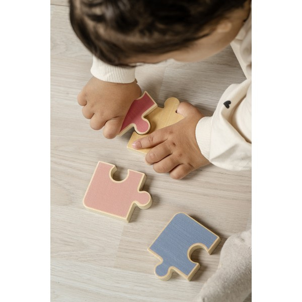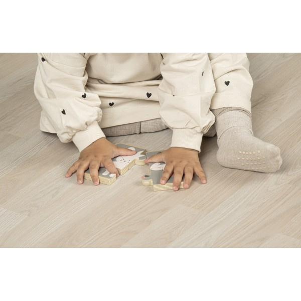 - dwustronna układanka : z jednej strony mamy kolorową łamigłówkę, czteroelementowe puzzle do połączenia z drugiej zaś strony przywita nas uroczy królik - ta układanka zachęca dziecko do samodzielnego ukłądania, dopasowywania i rozwiązywania - wykorzystując wyobraźnię i kreatywność, układanka z królikiem - stanowi wyzwanie, gdzie dziecko musi odkryć odpowiednie wzory.