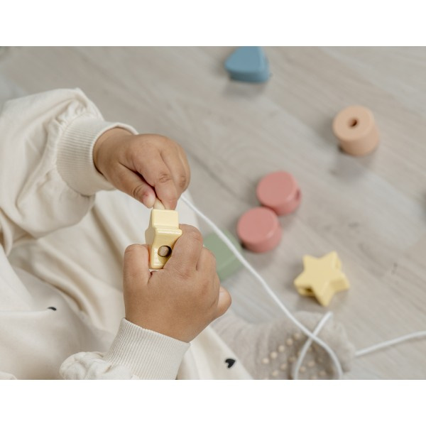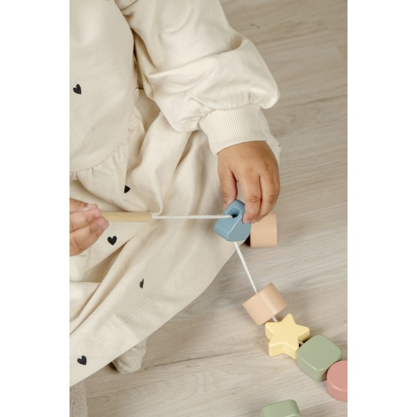 -drewniane klocki do nawlekania - doskonała zabawka wspierająca rozwój motoryki małej, zręczności i koordynacji wzrokowo-ruchowej, zaprojektowana tak, by zachęcać dzieci do poznawania kształtów i kolorów, by dzieci z łatwością mogły nawlekać koraliki na sznurek - tworząc swoje małe arcydzieła, rozwijając kreatywności i zdolności artystyczne.
