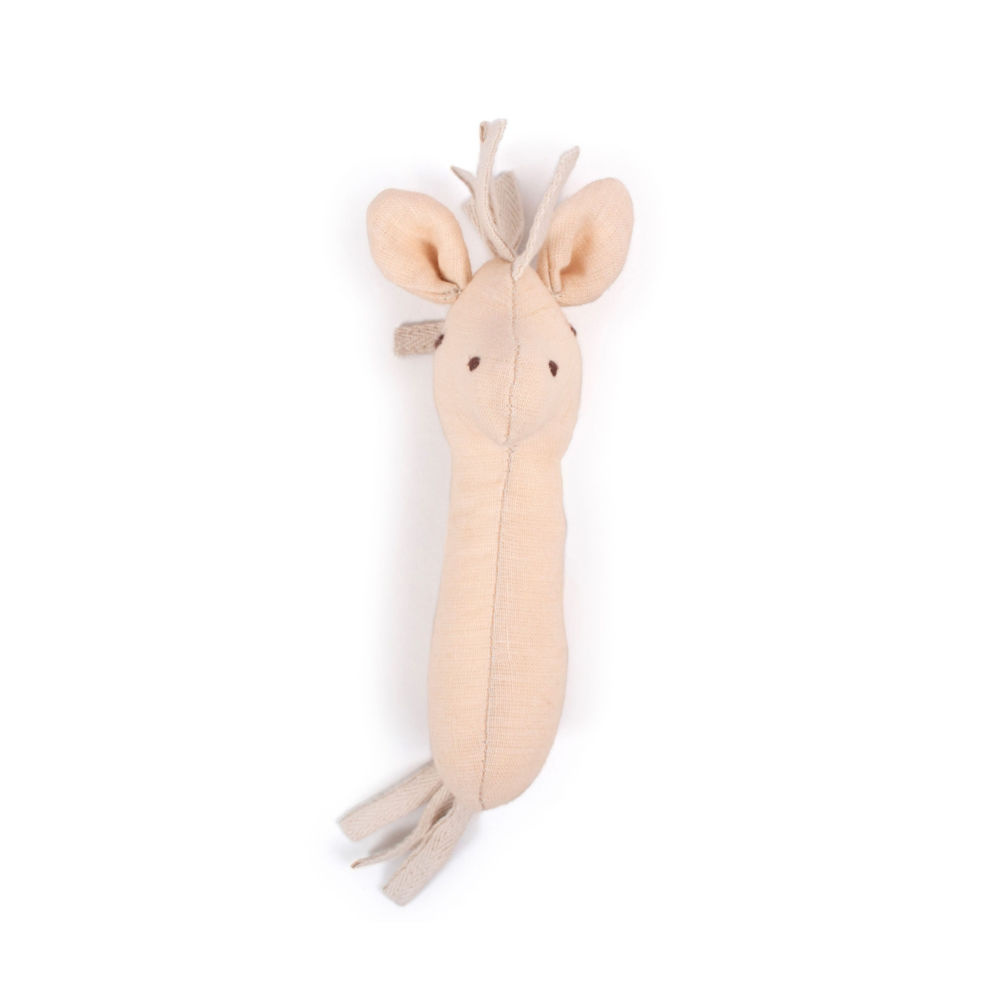 Ta urocza, mała grzechotka w kształcie marchewki wykonana została z miękkiej lnianej tkaniny i może być używana już od pierwszych dni życia.