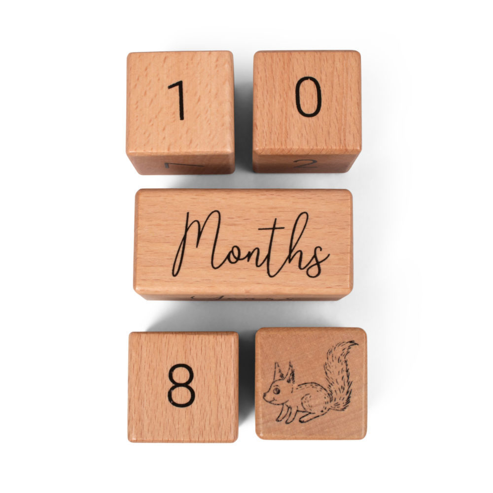 Metryczka Drewniane klocki do zdjęć Filibabba, to zestaw 5 elementów, na których znajdują się urocze rysunki, cyfry od 0 do 9, dni tygodnia, miesiące i lata. Klocki mogą pełnić też funkcję dekoracyjną, a dzięki zaokrąglonym rogom, idealnie pasują do małych rączek. Klocki zostały wykonane z drewna bukowego, z dbałością o szczegóły, dzięki czemu sprawdzą się idealnie jako pomysł na prezent dla przyszłej mamy, na Baby Shower oraz z okazji narodzin maluszka.