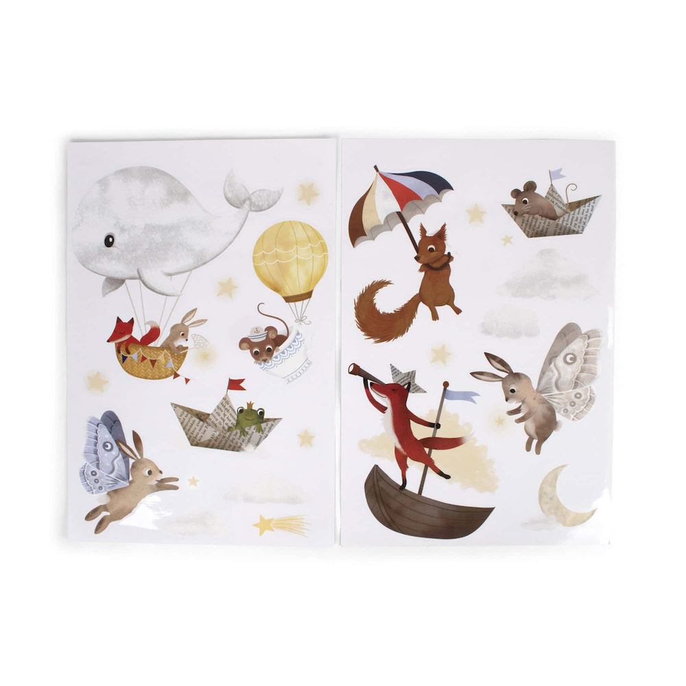 Zestaw Dreamy Adventurers zawiera 20 pięknie ilustrowanych naklejek, w tym motywy takie jak myszka w balonie na gorące powietrze, migoczące gwiazdy i delikatne chmurki. Ręcznie rysowane postaci unoszą się w przestworzach, wnosząc do pokoju dziecka pogodną atmosferę i czarującą estetykę. Naklejki te zapraszają małych odkrywców do świata pełnego przygód i fantazji.