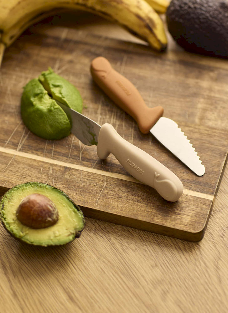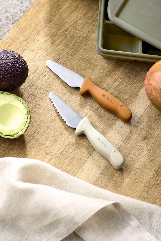 Zestaw dwóch noży: ząbkowany + zwykły Stal nierdzewna i miękkie silikonowe uchwyty z barierkami bezpieczeństwa Możliwość mycia w zmywarce Zapakowany w urocze pudełko na prezent Wiek: od 3 lat
