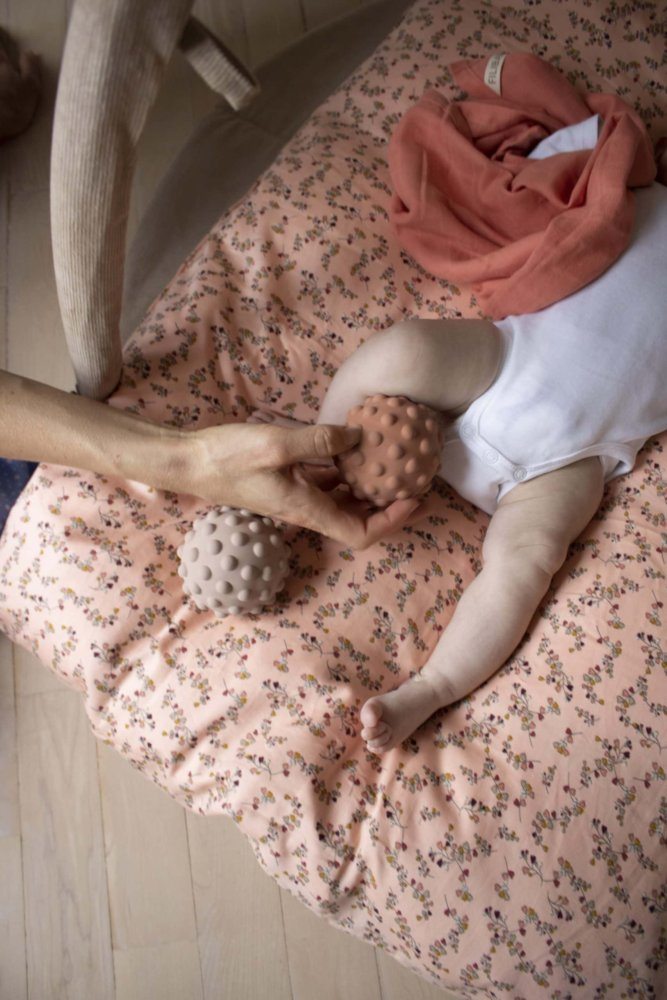 Piłka Nor została wykonana w 100% z naturalnej gumy. Pomaga stymulować zdolności motoryczne dziecka, odruch chwytania i łapania. W środku znajduje się dzwoneczek, który może pełnić też funkcję grzechotki. Dzięki mini wypustkom w kształcie kolców piłeczka sprawdzi się jako masażer, rozluźniając napięcia mięśniowe małych dzieci. To także świetna alternatywa gryzaka, zwłaszcza podczas bolesnego ząbkowania, wypustki będą w delikatny sposób masować dziąsła.