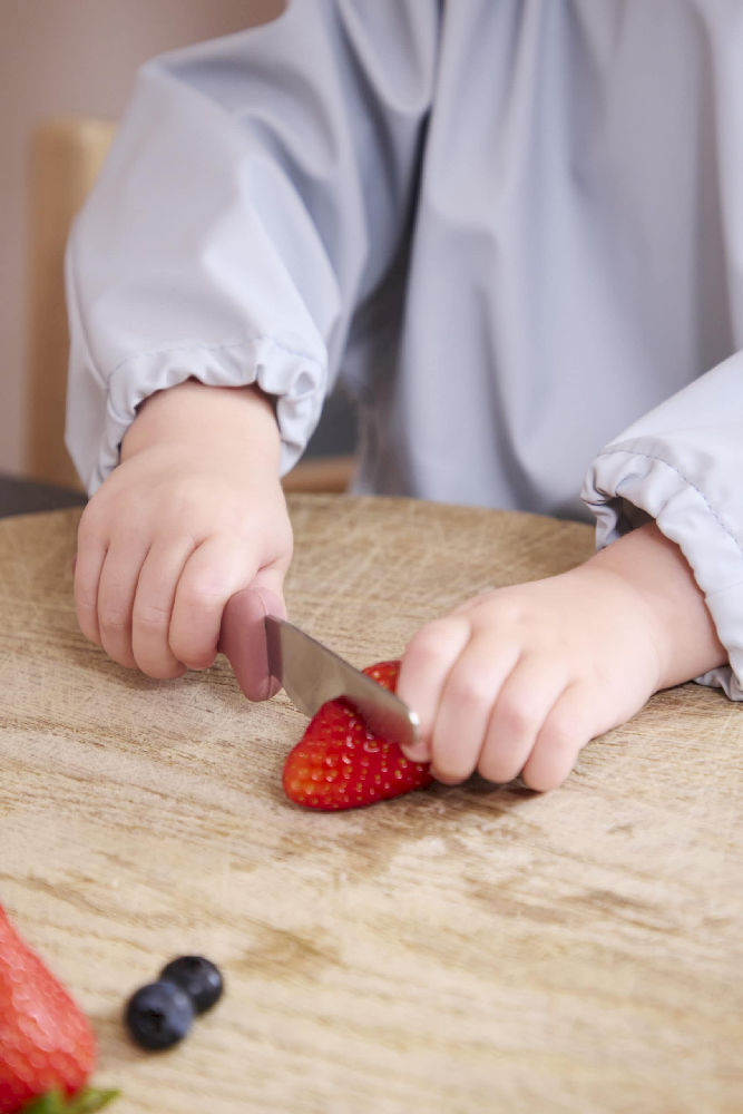 Śliniak ma praktyczne zapięcie na rzep pod szyją oraz wygodne gumki na nadgarstku, dopasowujące się do każdego maluszka.