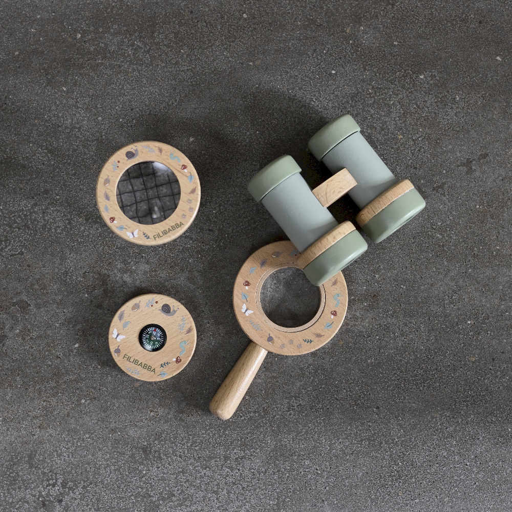 Ta magiczny zestaw składa się z lornetki do podglądania przyrody, kompasu, szkła powiększające oraz słoiczka na skarby.
