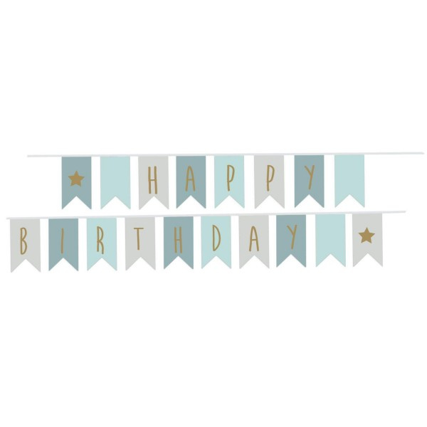 Papierowy łańcuch dekoracyjny Happy Birthady - idealny na przyjęcia urodzinowe. Ta duża girlanda w odcieniach błękitu składa się z osiemnastu flag o łącznej długości 3,5metra.