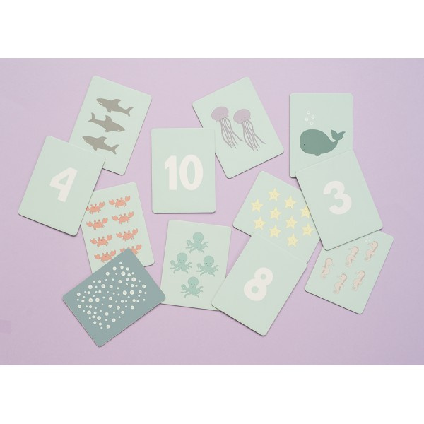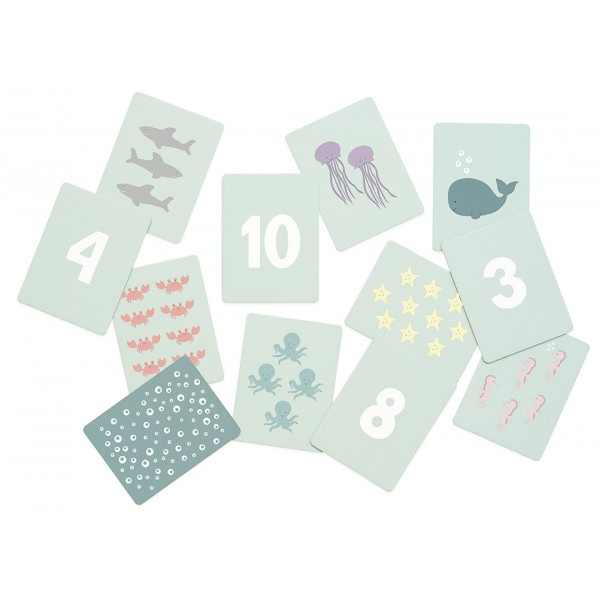 W grze znajdują się 20 kart obrazkowych, czyli 10 par kart związanych z morskimi stworzeniami - idealna do nauki jedzenie w obcym języku.