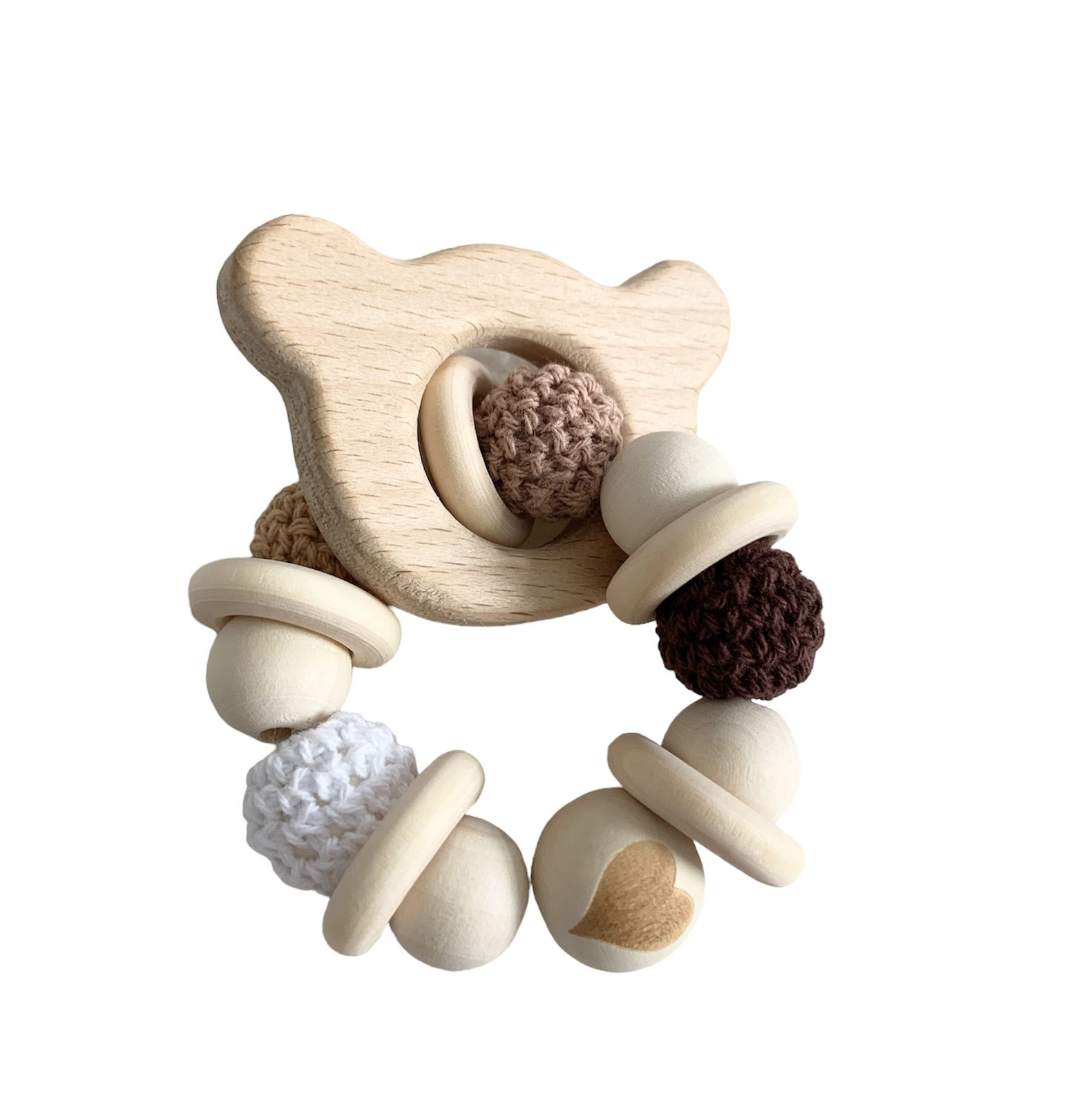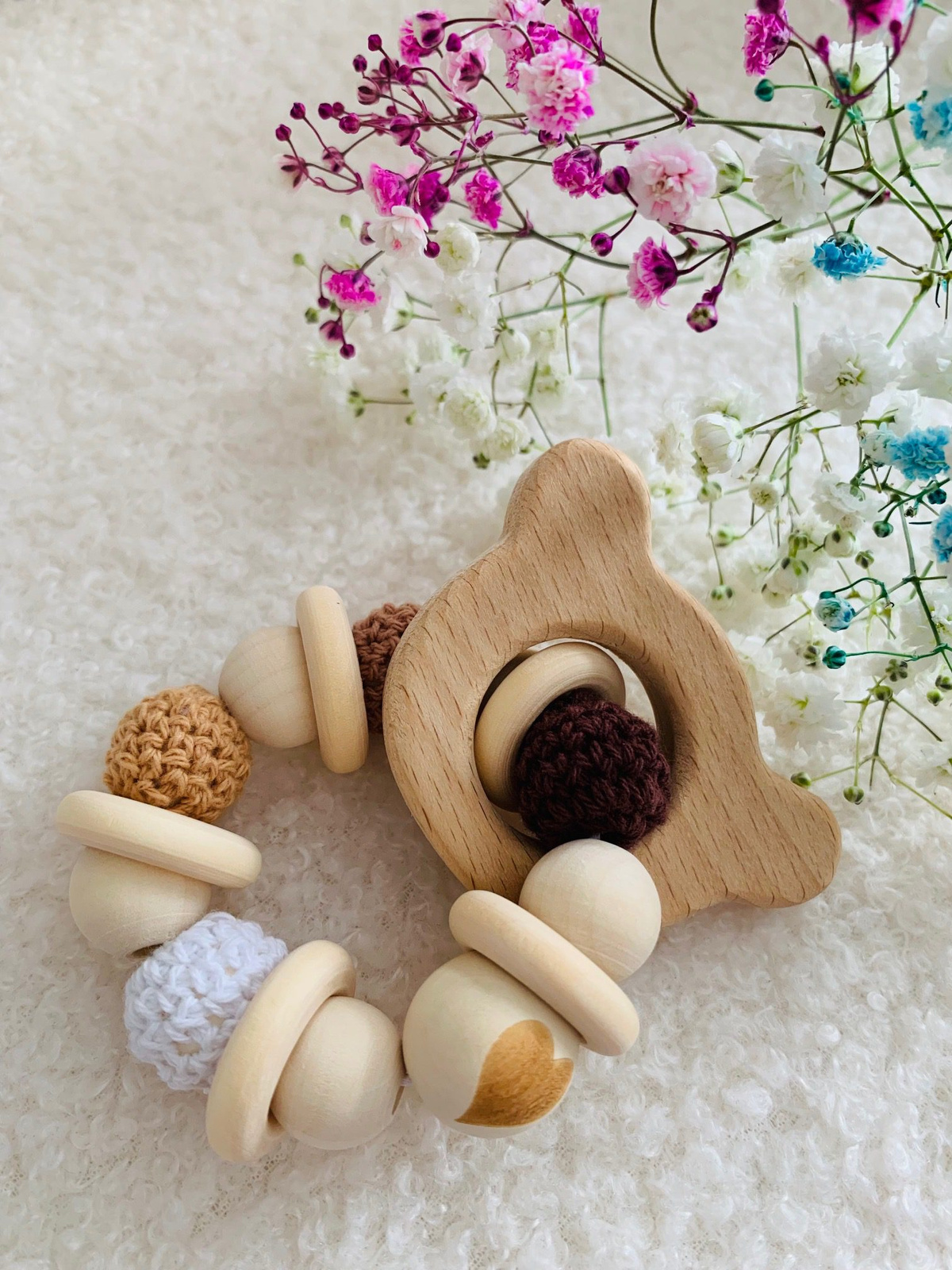 Gryzak, drewniana grzechotka dla niemowlaka, kolor biało-brązowy