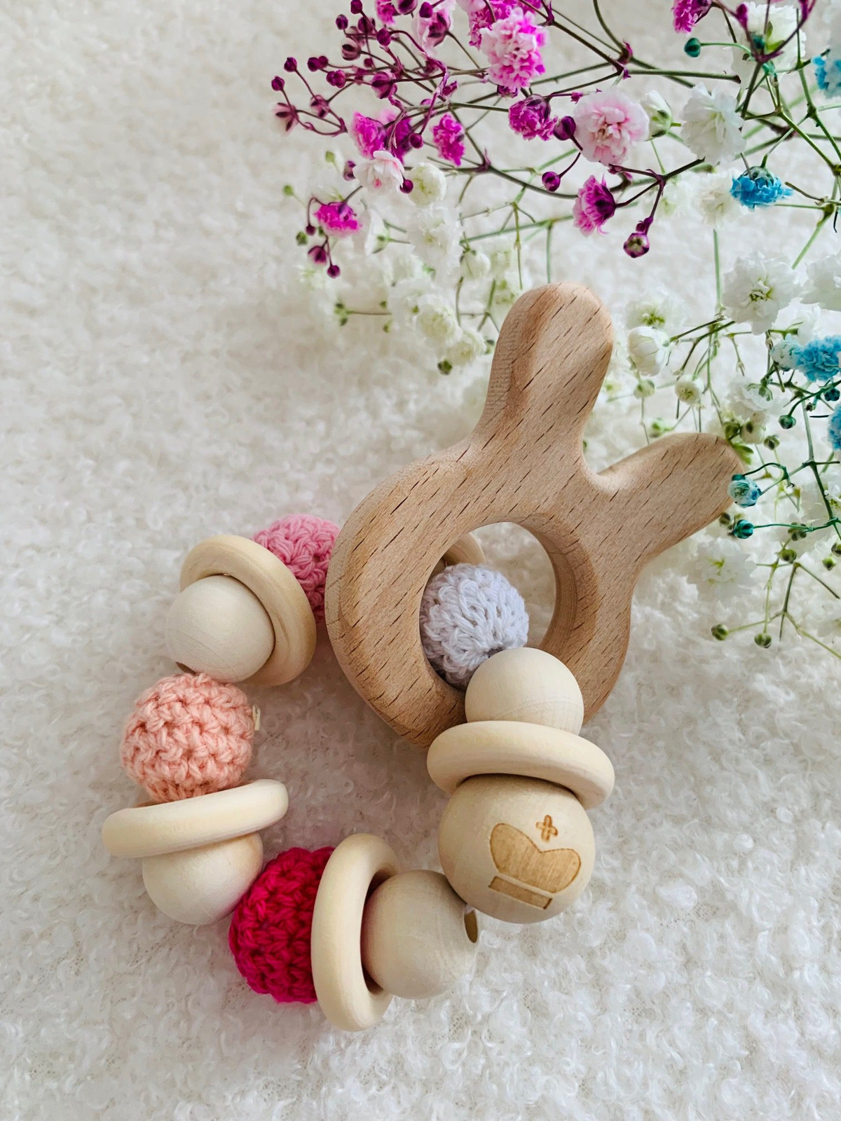 Gryzak, drewniana grzechotka dla twojego maluszka. Wykonany z drewna oraz bawełny. Niezastąpiony podczas ząbkowania.