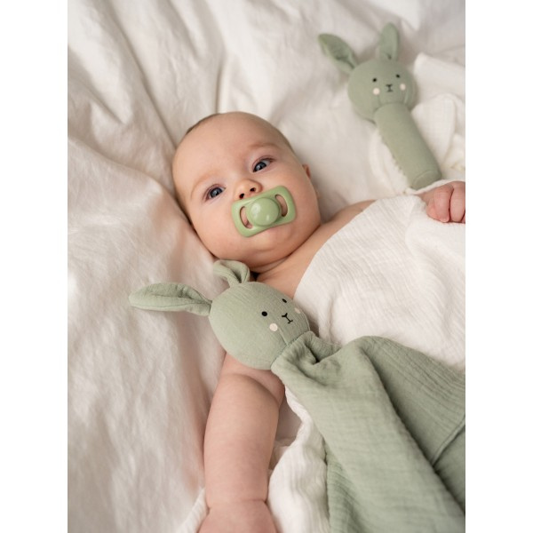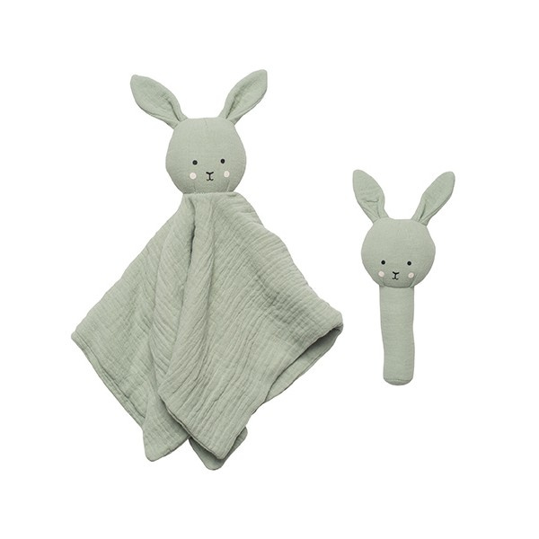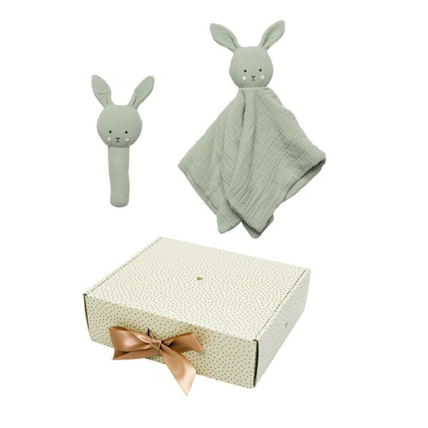 Eksluzywny zestaw upominkowy, idealny na prezent dla noworodka lub przyszłych rodziców na Babyshower: zawiera najlepiej sprzedające się akcesoria niemowlęce. W tym uroczym zestawie prezentowym, zapakowanym w eleganckie pudełko znajdują się grzechotka oraz szmatka przytulanka szałwiowy królik, oba produkty wykonane z 100% muślinowej bawełny, są mięciutkie i milutkie dla niemowląt. Szmatka przytulanka z pewnością utuli do snu niejedno niemowlę, a urocza grzechotka jest idealna do nauki chwytania i ćwiczeń koordynacji ręka-oko.
