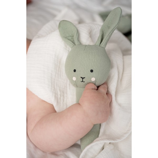 Grzechotka i szmatka przytulanka- zestaw upominkowy szałwiowy królik Jabadabado