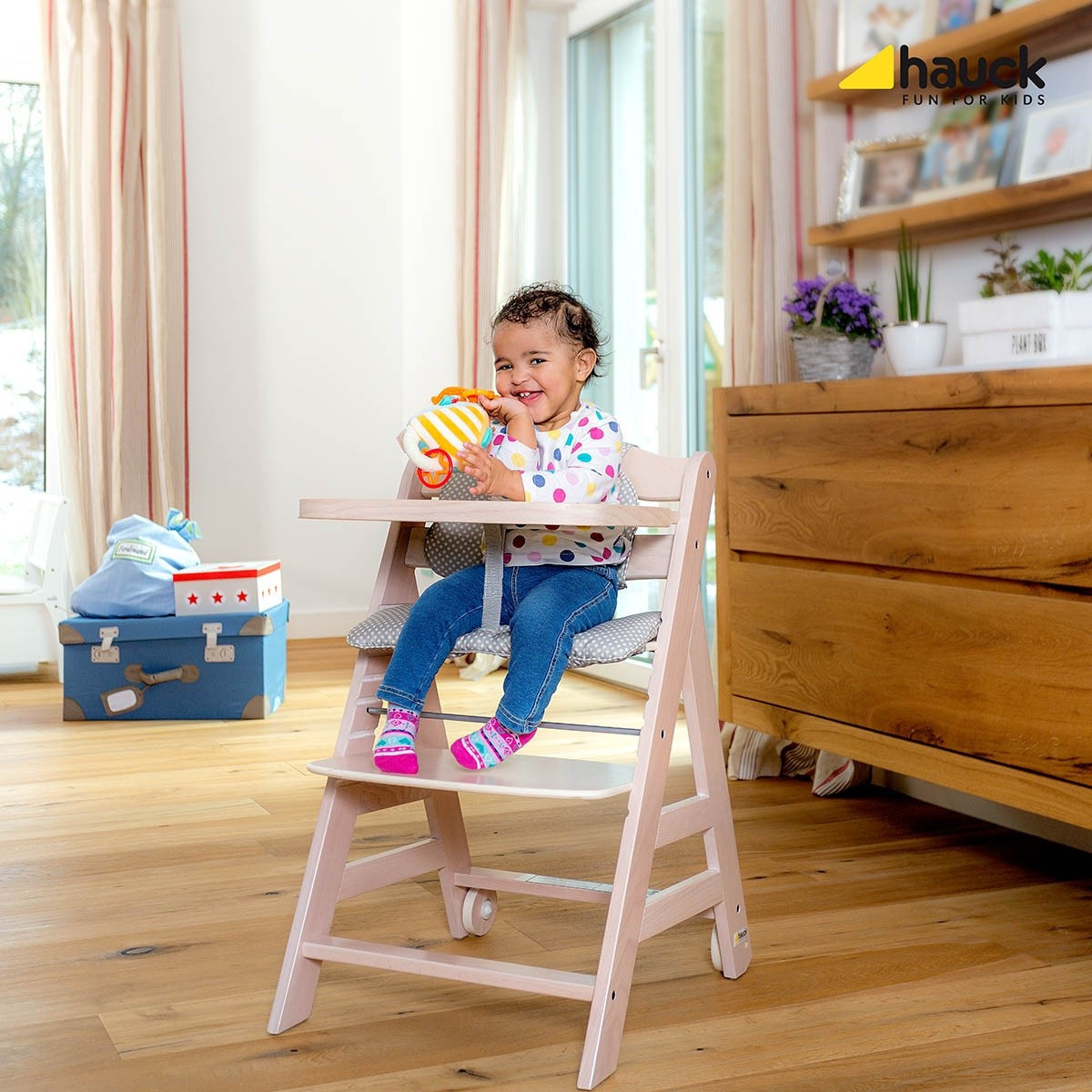 Drewniane krzesło typu grow-along może być wykorzystywane na różne sposoby. Taca na jedzenie lub uchwyt z przodu z 5-punktowym pasem lub osłoną krocza. 5-punktowy system pasów jest mocowany z tyłu za pomocą rzepów i może być dostosowywany do wielkości dziecka. Taśmy chroniące krocze montowane są w równie prosty sposób. Pasy można stosować w zależności od potrzeb.
