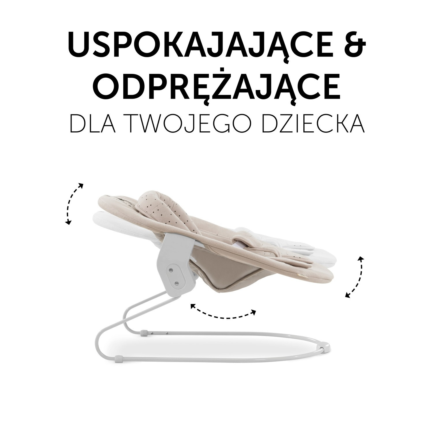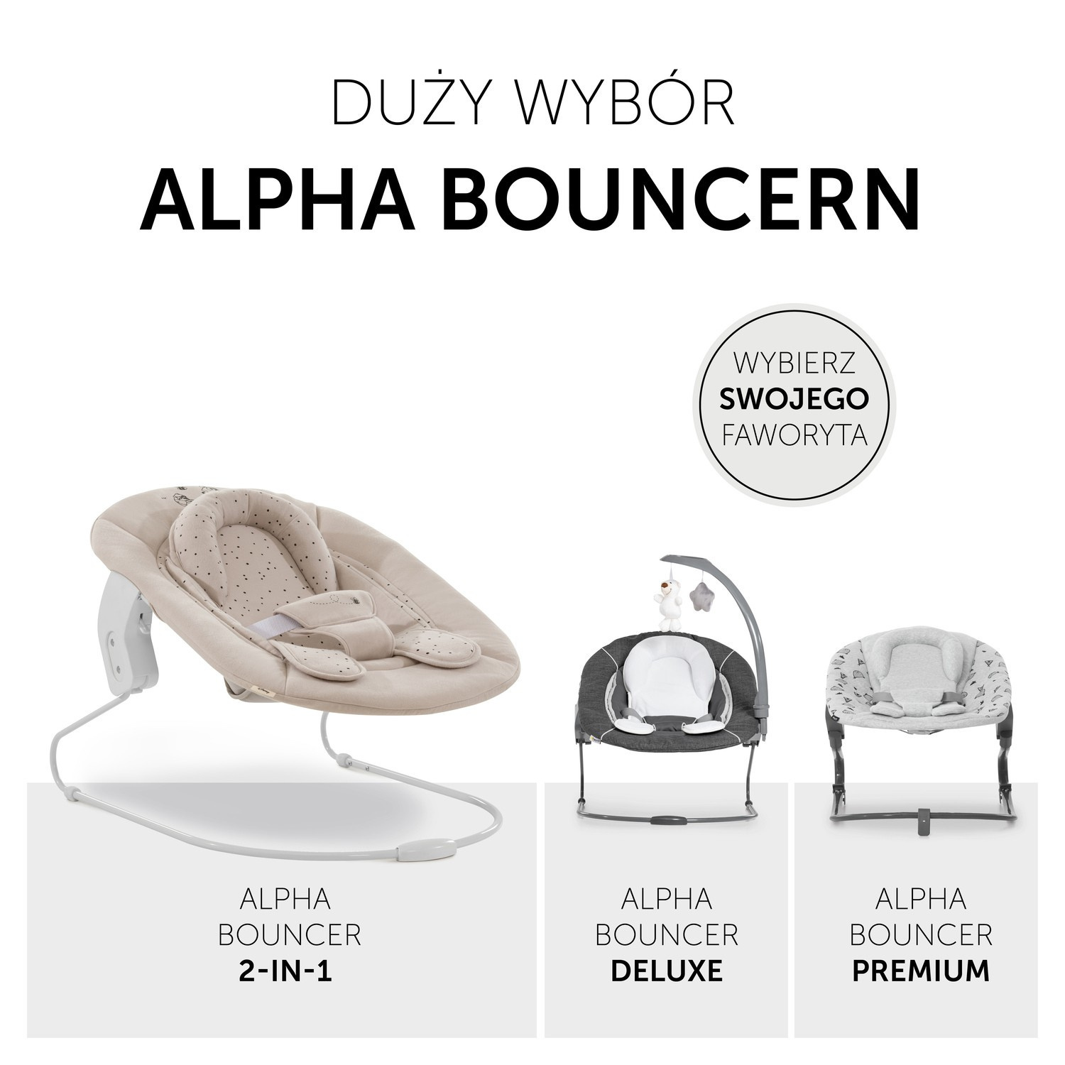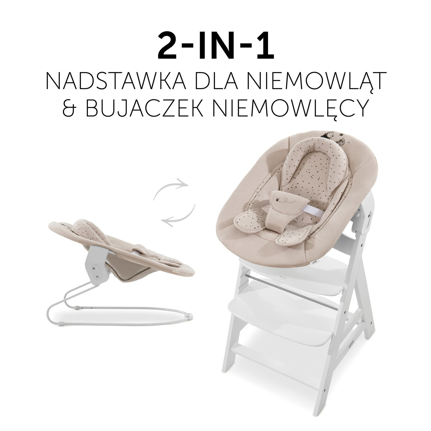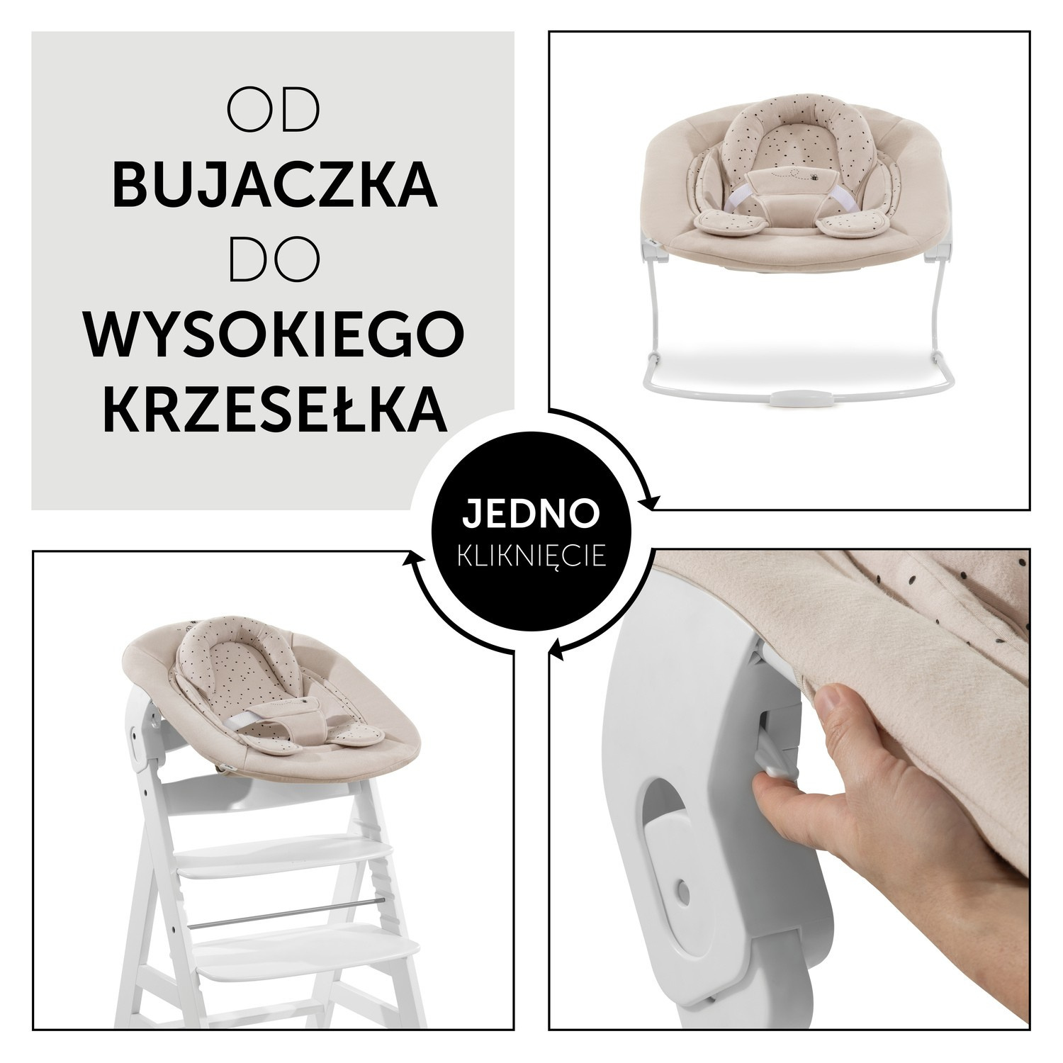 2 W 1 KOŁYSKA DZIECIĘCA I NAKŁADKA DLA NOWORODKA NA KRZESEŁKO DREWNIANE HAUCK Leżaczek 2 w 1 Alpha Bouncer spełnia dwie funkcje: służy jako kołyska wraz z dostarczonym w komplecie stelażem lub jako nakładka na drewniane krzesełko do karmienia Alpha+. Dzięki temu rozwiązaniu twoje maleństwo jest już od początku z wami przy stole, uczęstnicząc w pełni w życiu rodzinnym. Przy pomocy kilku ruchów Alpha Bouncer nakładany jest na boki stabilnego krzesełka do karmienia, będąc bezpiecznie zamocowanym i gotowym od razu do użycia. W ten sposób twój skarb jest zawsze przy tobie, na wysokości oczu, co wzmacnia waszą więź oraz jest wygodne dla twoich pleców podczas karmienia buteleczką. 3-punktowe zapięcie zabezpiecza twoje dziecko. Miękki materiał pokrowca, boczne obicie i wyjmowana wkładka pomniejszająca zapewniają niemowlęciu płaską, ergonomiczną pozycję leżącą oraz bezpieczeństwo i komfort. Przytulne tkaniny delikatnie otulają skórę dziecka. Poszycie może być zdjęte i wyprane. Zmiana funkcji Alpha Bouncer z nakładki na krzesełko w kołyskę jest bardzo prosta: jednym ruchem uwalniasz nadstawkę z krzesełka i nakładasz ją na dostarczony stelaż, tworząc w ten sposób bujaczek. Dziecko wprawia kołyskę własnymi ruchami ciała w lekkie kołysanie, co działa na nie uspokajająco.