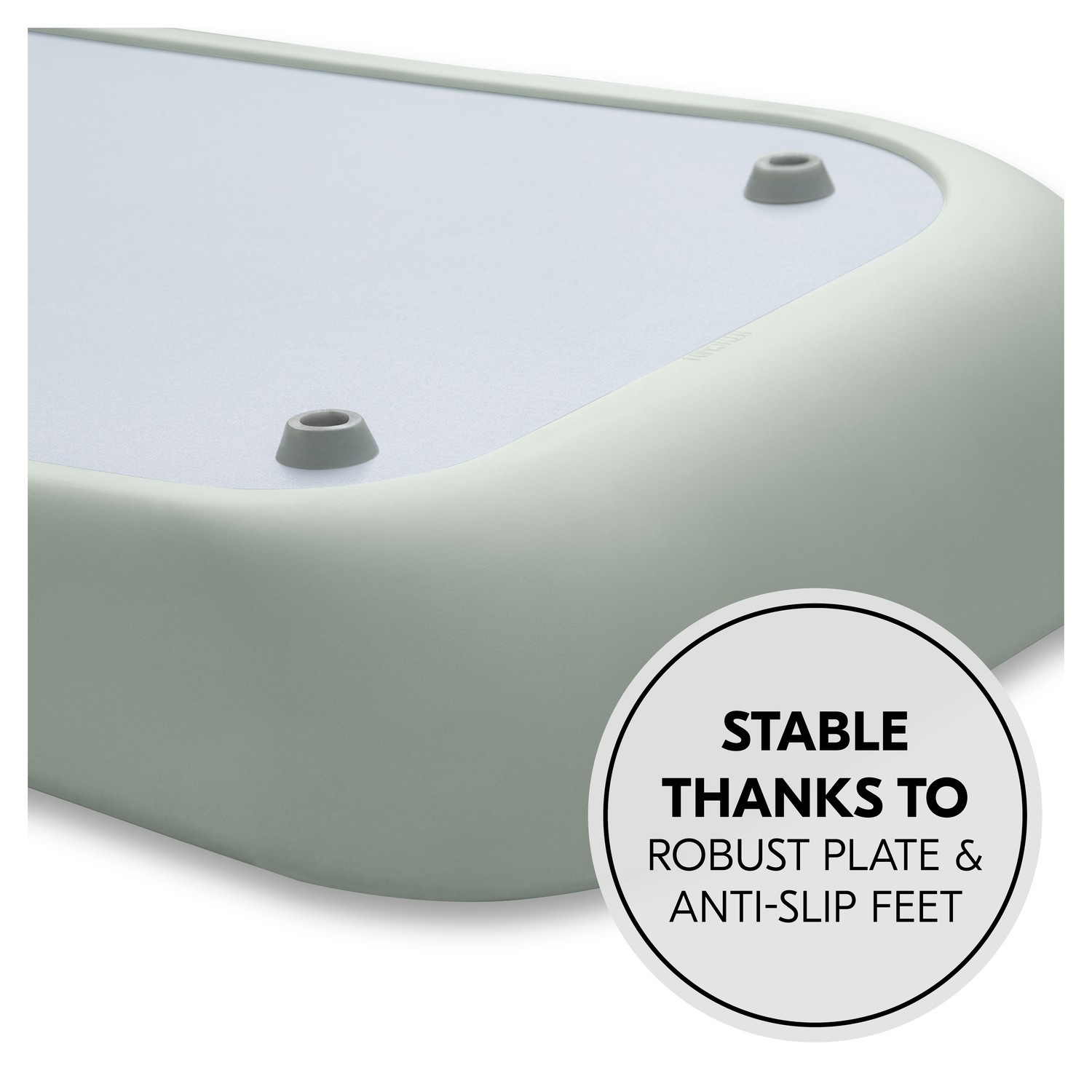 Stabilny stojak: przewijak ma cztery stabilne nóżki i stoi lekko uniesiony od podłogi, tworząc dodatkową poduszkę powietrzną między poduszką a podłogą.