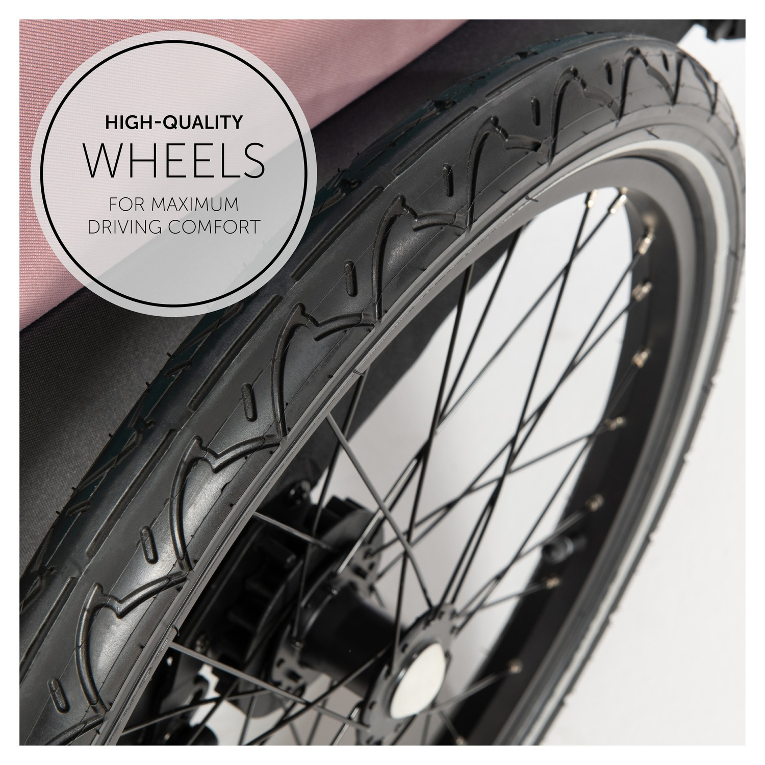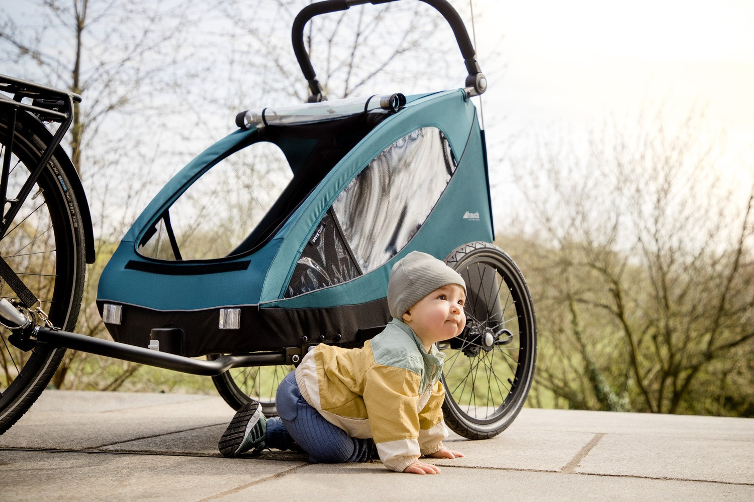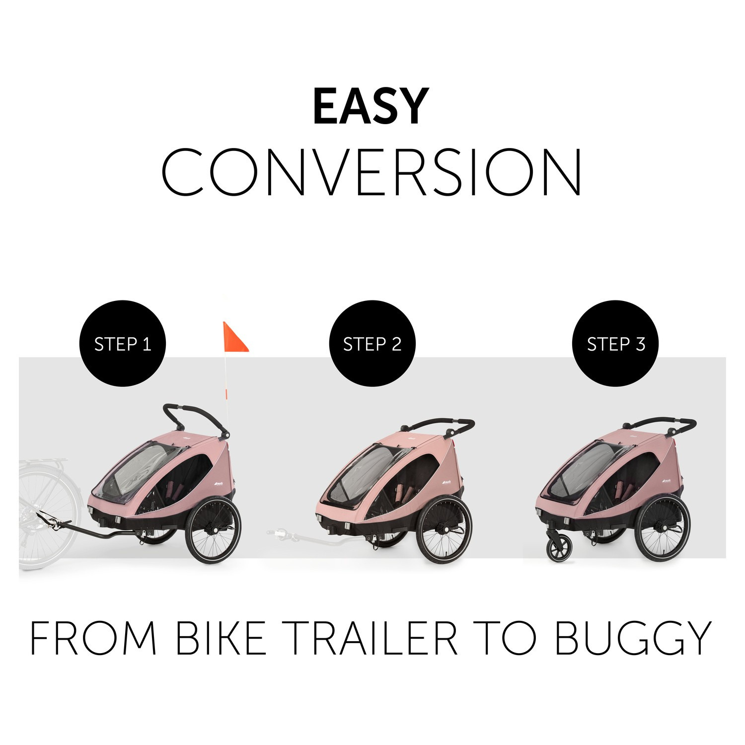 Przestronna konstrukcja oferuje wygodne miejsce dla dwojga dzieci od 6 miesiąca życia do wagi każdorazowo 22 kg oraz wzrostu 120 cm. Łatwe za- i odczepianie oraz konwersja za pomocą tylko 4 posunięć umożliwia w każdym momencie zmianę funkcji przyczepki rowerowej na spacerówkę lub odwrotnie. Szare przyciski funkcji ułatwiają intuicyjną obsługę.