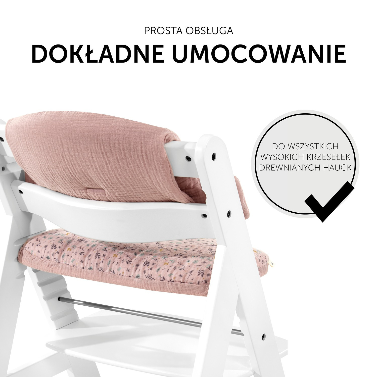 KOMFORTOWY POMNIEJSZACZ SIEDZISKA Z OBUSTRONNIE WYMOSZCZONĄ PODUSZKĄ POD PLECY Dwuczęściowa nakładka służy jako pomniejszacz siedziska przede wszystkim w pierwszych miesiącach, w których twoje dziecko siedzi w drewnianym krzesełku Alpha+. Obustronnie wymoszczona poduszka pod plecy, wraz z miękką poduszką na siedzisko zapewniają dziecku stabilność i wysoki komfort siedzenia. Poduszka wykonana z miękkiego muślinu jest szczególnie przyjazna dla skóry twojego maleństwa. Dwuwarstwowo utkana tkanina bawełniana zapewnia wymianę powietrza i reguluje wilgotność. Zapobiegając kumulacji powietrza jest przyjemna dla twojego dziecka również w ciepłe dni. Wysokiej jakości nakładka posiada od spodu powłokę antypoślizgową. W ten sposób poduszka nie przesuwa się, nawet podczas zabawy z twoim dzieckiem. Highchair Pad Select nadaje się do każdego drewnianego krzesełka hauck, wraz z obydwomu systemami zapięć. Nakładka pasuje idealnie do drewnianych krzesełek hauck, bo została ona specjalnie dla nich zaprojektowana. Mocuje się ją łatwo i szybko za pomocą zatrzasków. Highchair Pad Select jest kompatybilny ze stolikiem Alpha Tray - w ten sposób dostępny osobno stolik, jak i miękko wymoszczona nakładka mogą być jednocześnie zamocowane do drewnianego krzesełka.