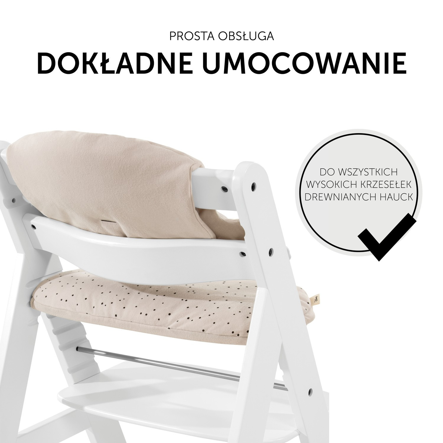Nakładka pasuje idealnie do drewnianych krzesełek hauck, bo została ona specjalnie dla nich zaprojektowana. Mocuje się ją łatwo i szybko za pomocą zatrzasków. Highchair Pad Select jest kompatybilny ze stolikiem Alpha Tray - w ten sposób dostępny osobno stolik, jak i miękko wymoszczona nakładka mogą być jednocześnie zamocowane do drewnianego krzesełka.Gwarancja producenta na 2 lata