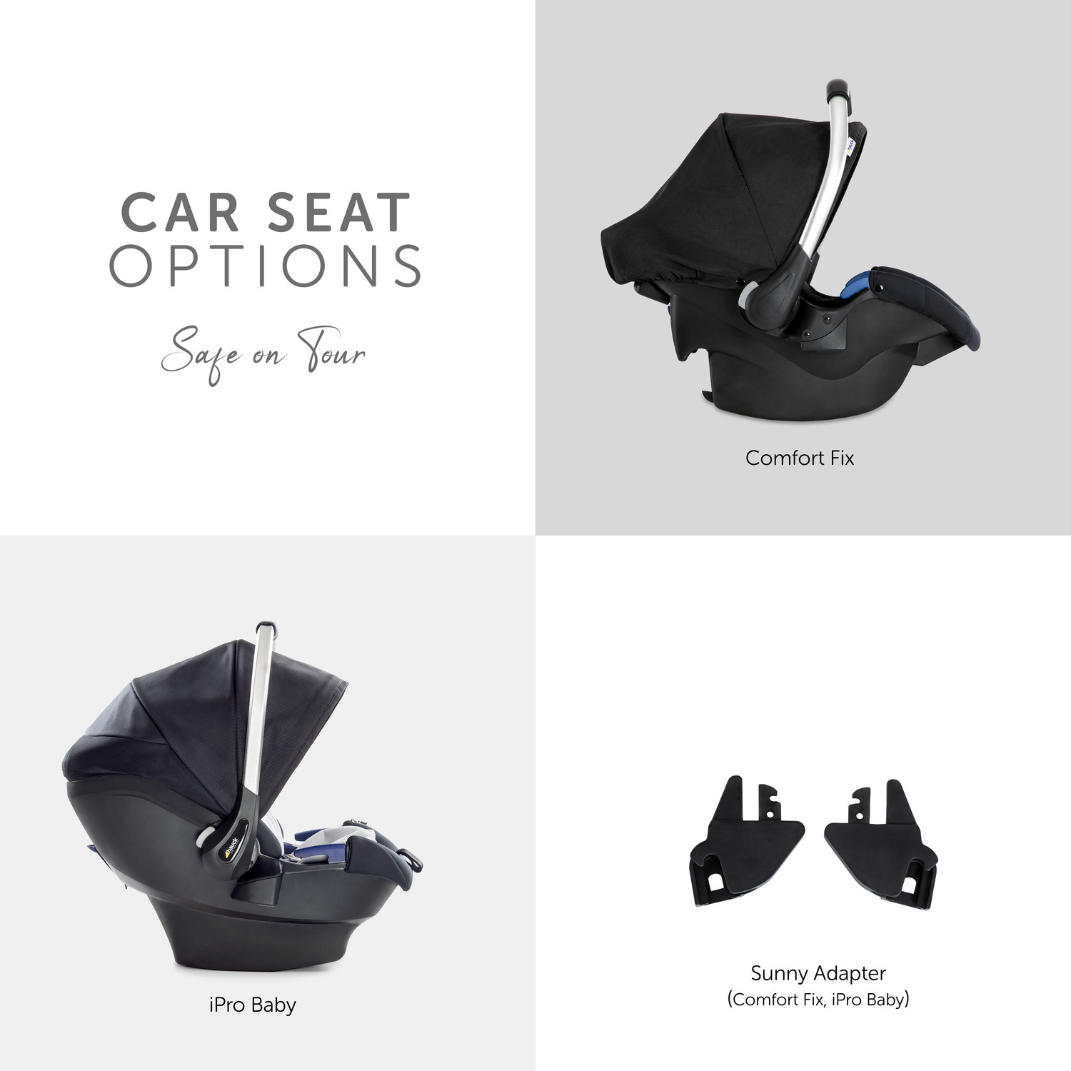 Nasza rekomendacja: dzięki osobno dostępnym adapterom, możesz zamocować zarówno foteliki samochodowe iPro Baby (i-Size), jak i Comfort Fix (ADAC: GOOD) na podwoziu wózka. To daje praktyczny system Shop'n Drive na krótkie wycieczki po mieście.
