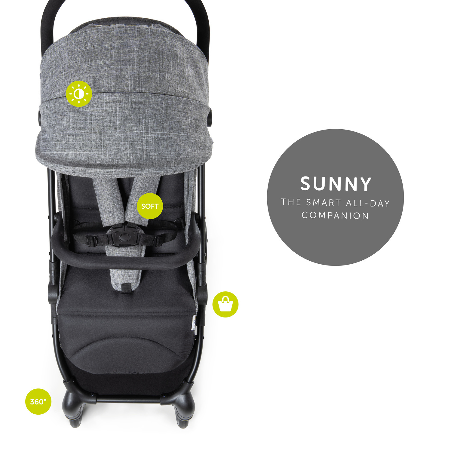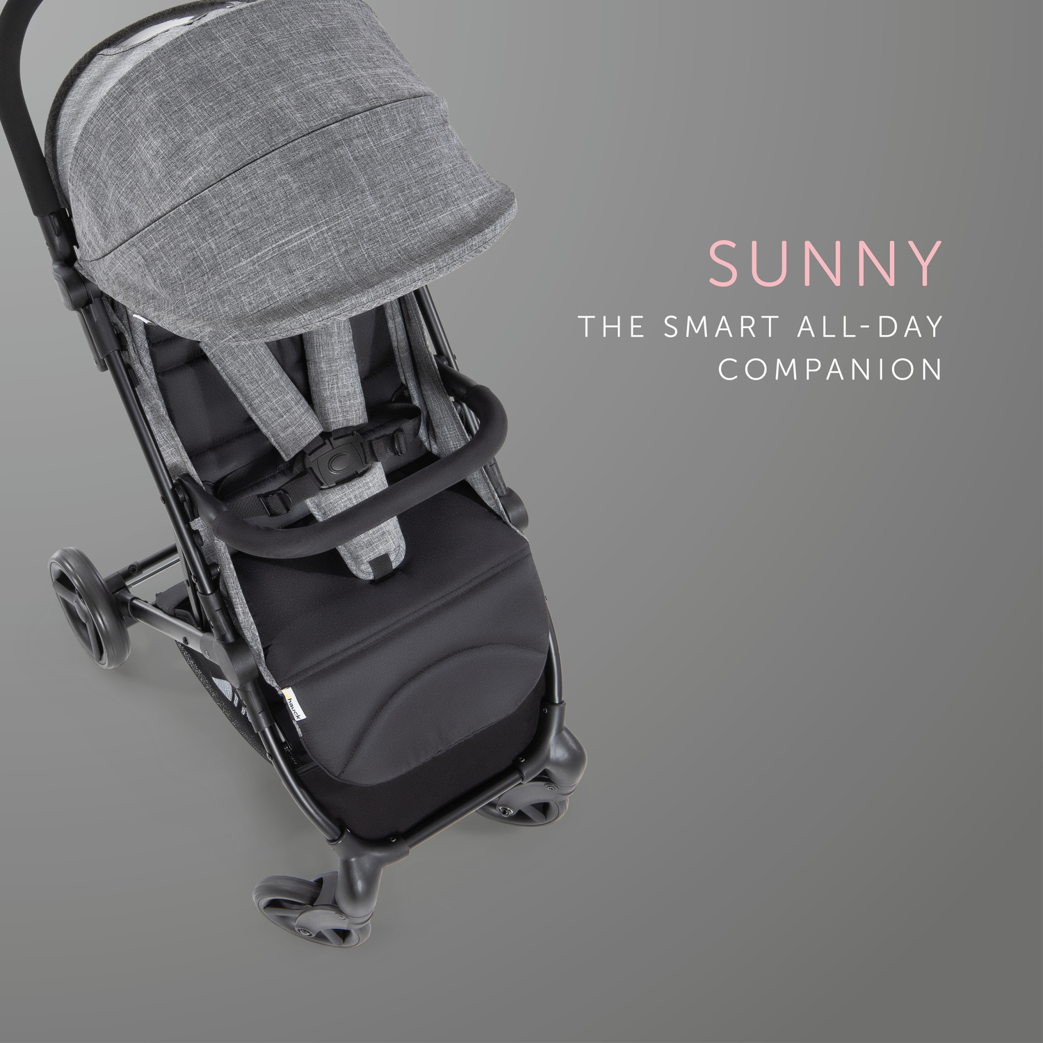 Sunny - wszechstronny towarzysz miejski o kompaktowych rozmiarach. Ten lekki wózek spacerowy może być używany od pierwszych dni życia, zarówno w pozycji leżącej, jak i w połączeniu z fotelikiem samochodowym dla niemowląt. Po złożeniu jedną ręką, pasuje do niemal każdego bagażnika samochodowego.