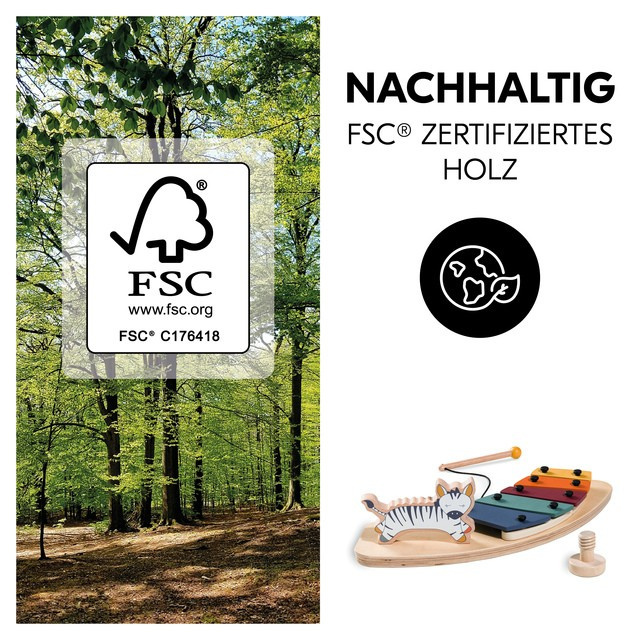 Blat do zabawy błyskawicznie mocuje się do podstawy za pomocą drewnianej śruby, dzięki czemu pozostaje on bezpiecznie na swoim miejscu podczas zabawy. Gra wykonana jest z drewna, które pochodzi z lasów z certyfikatem FSC® i inspiruje pięknymi kolorami oraz uroczym, przyjaznym dla dziecka designem. Gładkie powierzchnie zrównoważonej zabawki można w razie potrzeby łatwo wytrzeć wilgotną szmatką.
