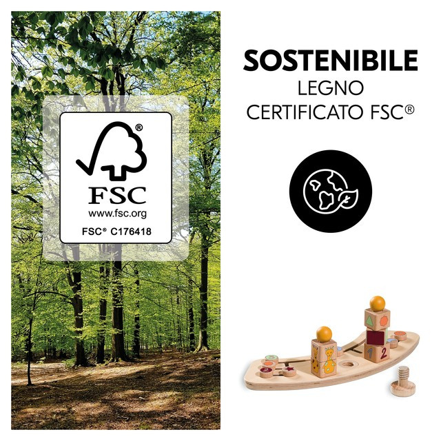 Blat do zabawy błyskawicznie mocuje się do podstawy za pomocą drewnianej śruby, dzięki czemu pozostaje on bezpiecznie na swoim miejscu podczas zabawy. Gra wykonana jest z drewna, które pochodzi z lasów z certyfikatem FSC® i inspiruje pięknymi kolorami oraz uroczym, przyjaznym dla dziecka designem. Gładkie powierzchnie zrównoważonej zabawki można w razie potrzeby łatwo wytrzeć wilgotną szmatką.