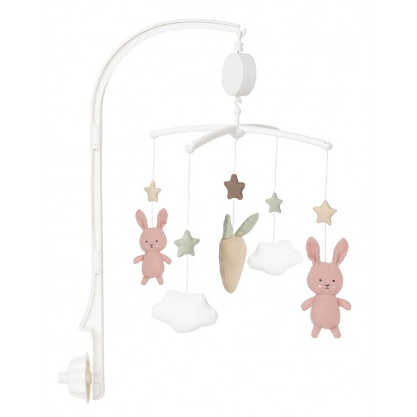 Urocza karuzela, pozytywka nad dziecięce łóżeczko z piękną spokojną melodyjką, która ukoi do snu Twojego malucha. Karuzela w komplecie razem z uchwytem mocującym, zaprojektowana przez szwedzką markę Jabadabado. Uroczy królik w różowej kolorystyce zaprzyjaźni się z Twoim maluchem na długo, a znajoma melodia ułatwi zasypianie. Karuzela jest nakręcana, posiada przycisk wyłączania kręcenia się pluszowych zabawek i możliwość samego puszczania melodii.