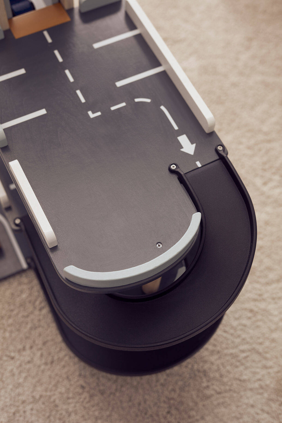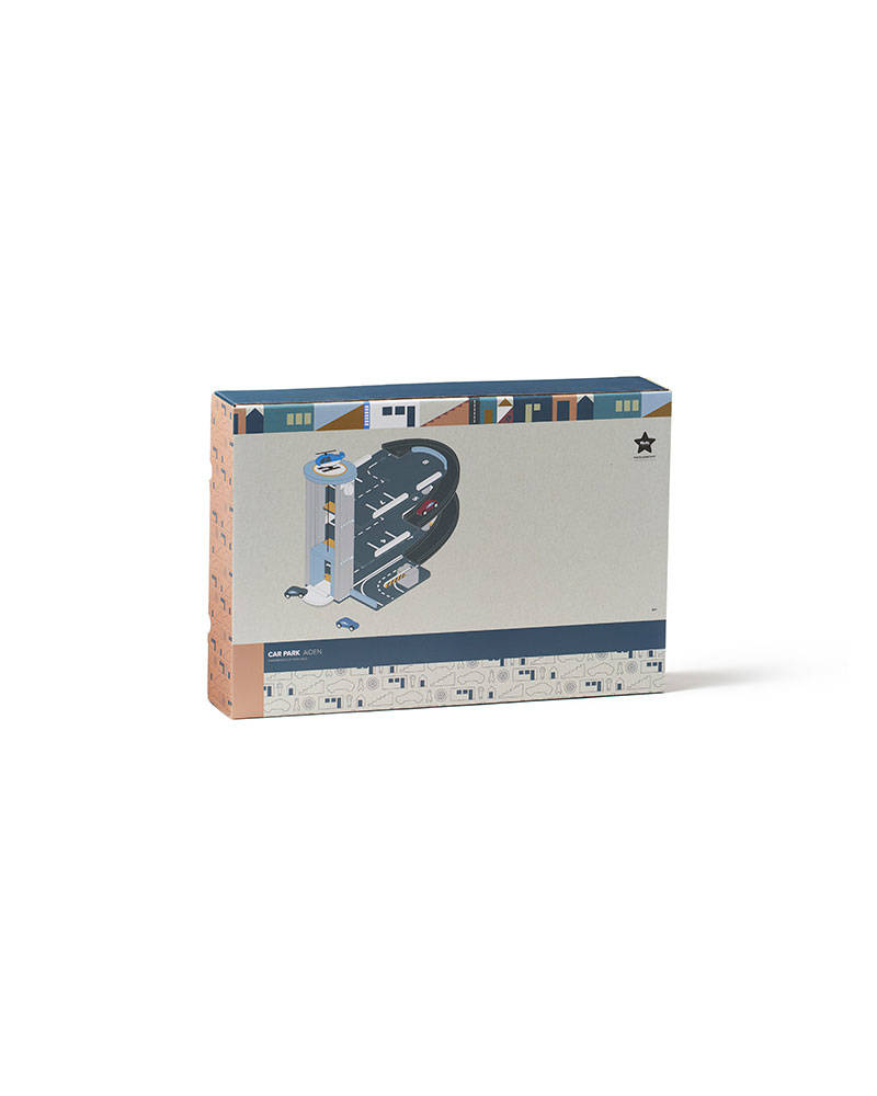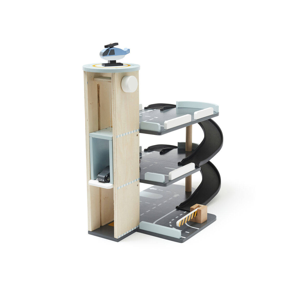 Trzypoziomowy drewniany garaż. Ma wszystko, czego potrzebuje Twoje dziecko, aby przeżywać ekscytujące przygody. Możesz wjeżdżać na górę i zjeżdżać w dół po rampach, na wszystkie poziomy może wjechać windą. Koniecznie zatrzymaj się przy szlabanie. A jeśli chcesz możesz wsiąść do helikoptera, który już czeka na lądowisku.