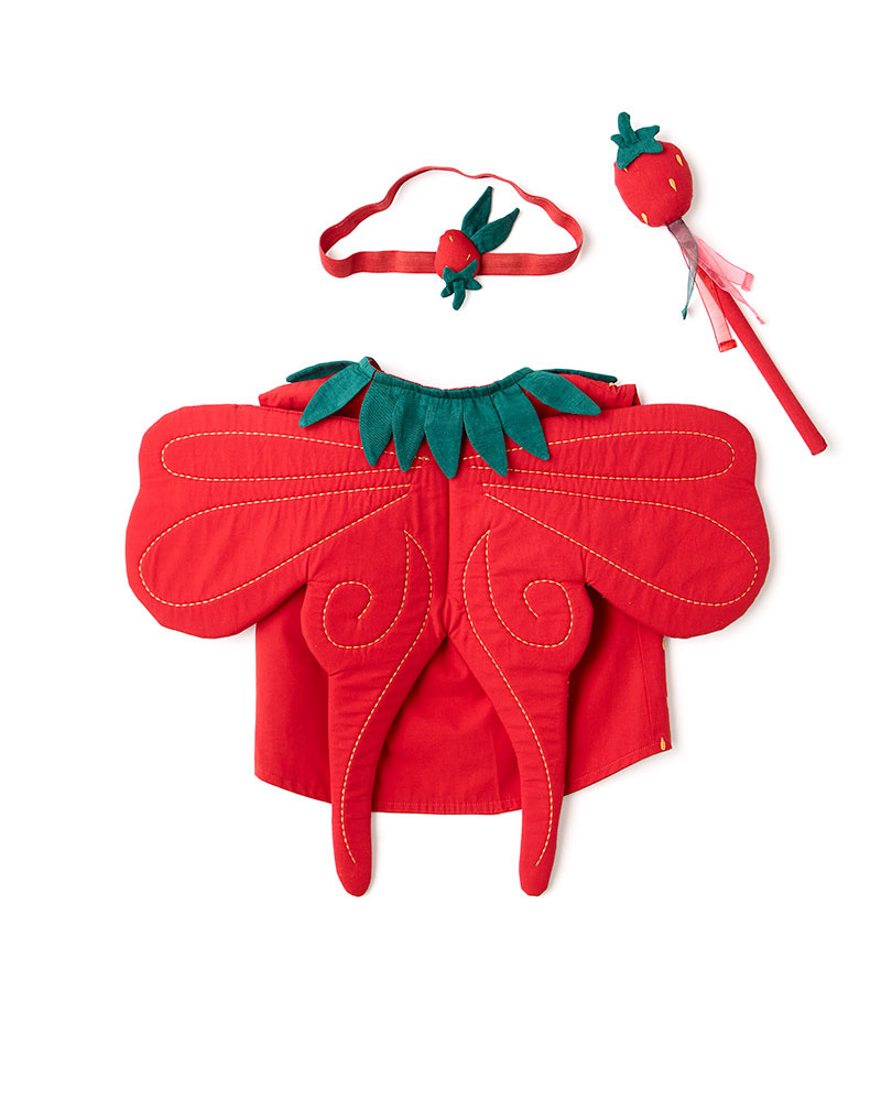 Słodka i orzeźwiająca – tak jak prawdziwe truskawki! Przebranie Truskawki wnosi letnią radość do zabawy w przebieranki. Czerwony kubraczek z zaokrąglonym przodem, zielonym kołnierzem w kształcie liści i zapięciem na rzepy ułatwia samodzielne zakładanie. Strój uzupełniają miękkie skrzydełka na plecach, opaska z dekoracyjną truskawką oraz różdżka – idealna do zabawy w tworzenie magicznych, owocowych ogrodów.