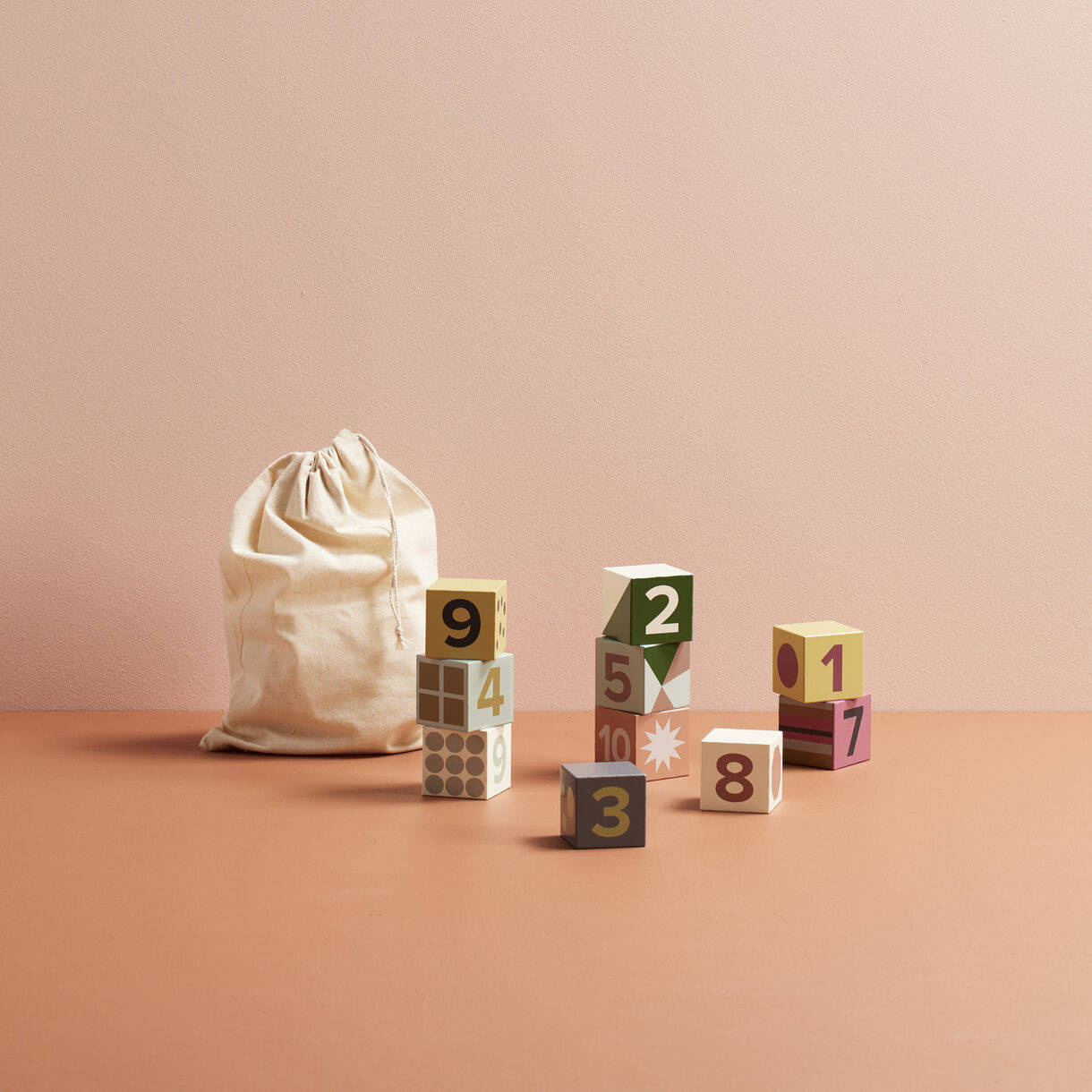 10 drewnianych klocków w wesołych kolorach. Klocki są ponumerowane (od 1 do 10) i oznaczone odpowiednimi symbolami po bokach. Klocek z cyfrą 4 ma po bokach namalowane cztery prostokąty, klocek z cyfrą 8 – ośmiokąt. Natomiast klocek z cyfrą 7 ma siedem pasków. Klockami można się bawić na wiele sposobów, np. układać je lub budować z nich konstrukcje. Możesz je także wykorzystać do nauki liczenia, rozpoznawania cyfr i kształtów. W zestawie z klockami jest bawełniana torba do przechowywania.