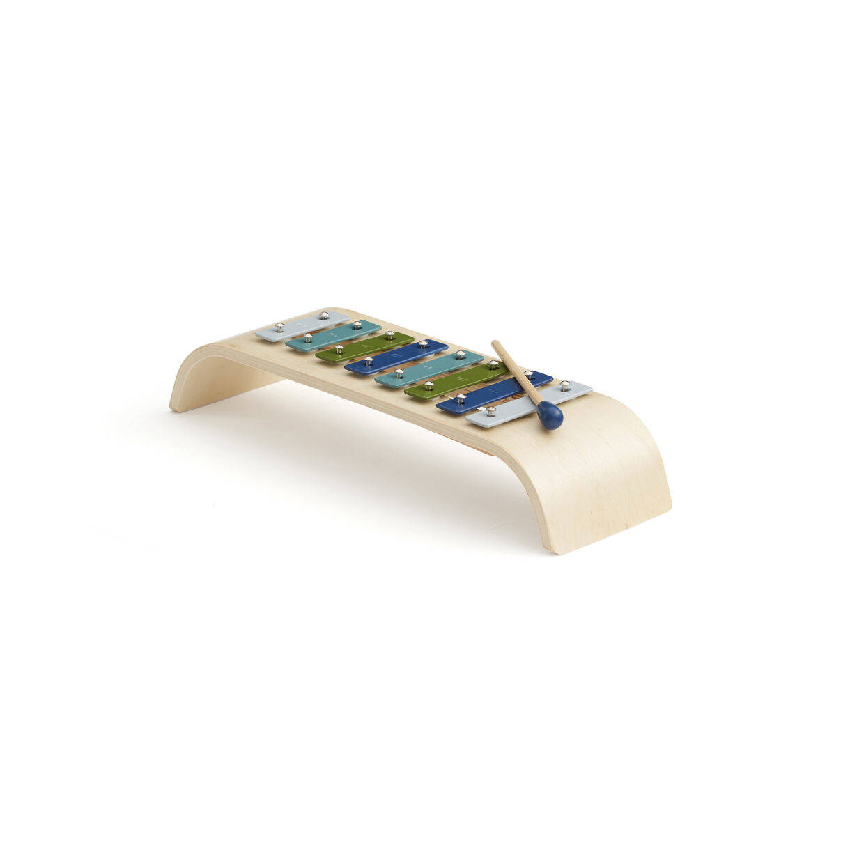 • Zabawkowy ksylofon ze sklejki bejcowanej naturalnie z białymi płytkami.