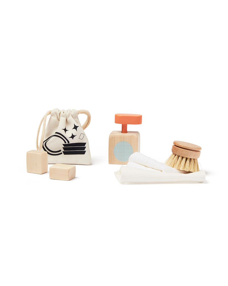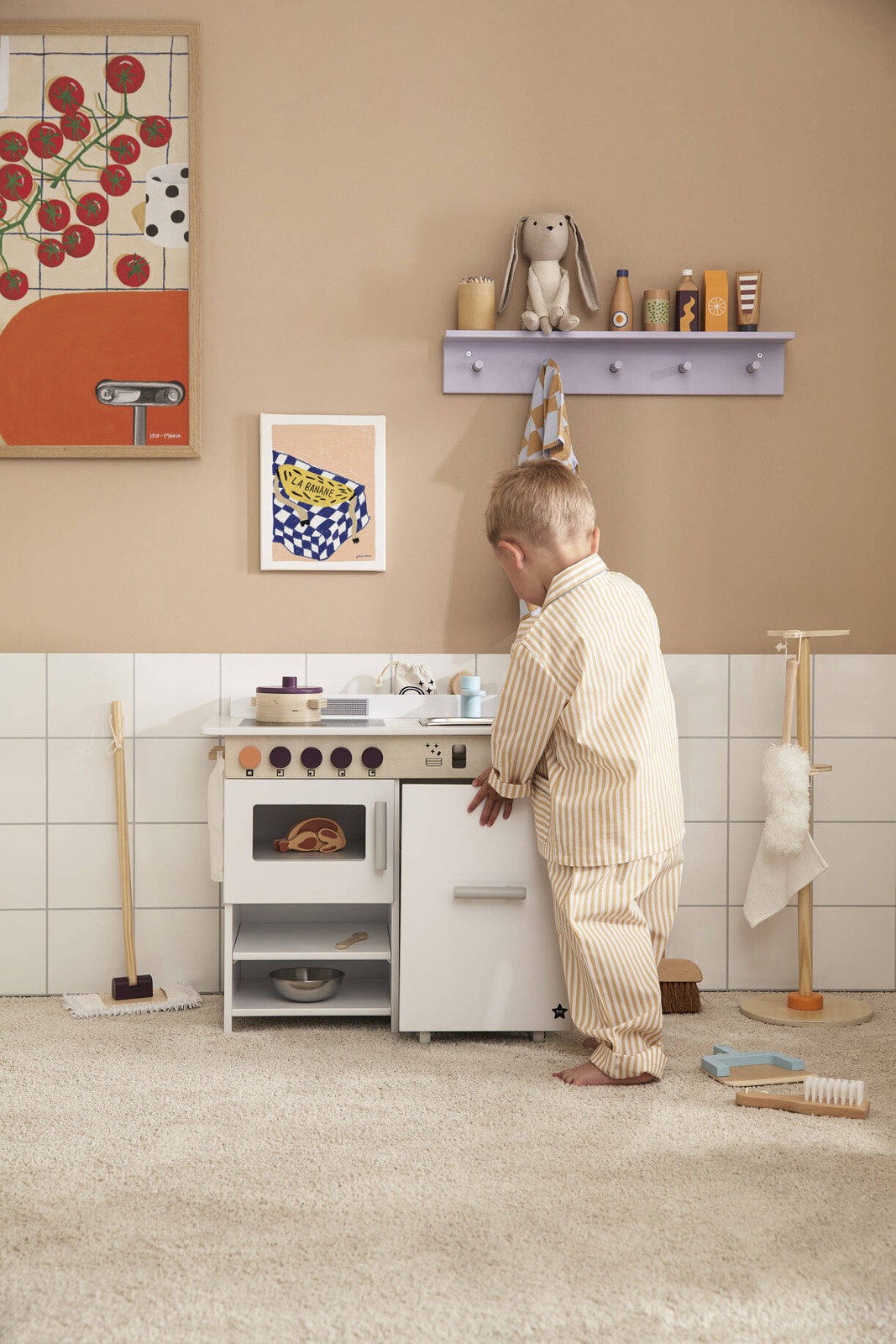 Bez obaw. Ta współczesna kuchnia jest wykonana z drewna z certyfikatem FSC i wyposażona w zmywarkę do naczyń, piekarnik, zlewozmywak, półki i zintegrowany okap kuchenny. Umieść kilka talerzy i sztućców na podstawce w zmywarce, a tabletkę włóż do otworu z przodu. Przekręć klikające pokrętło i gotowe. Jest też szczoteczka do mycia naczyń i płyn do usuwania wszelkich trudnych plam. Z boku znajdziesz trzy wieszaki, na których możesz zawiesić ściereczkę do naczyń. Zmywarka i przestrzeń pod piekarnikiem po zakończonej zabawie mogą stać się praktycznym schowkiem. Zestaw zawiera: kuchenkę i zmywarkę, ręcznik, szczoteczkę do naczyń, blachę do pieczenia, dozownik mydła w płynie z pompką i dwie tabletki do zmywarki w torbie do przechowywania.