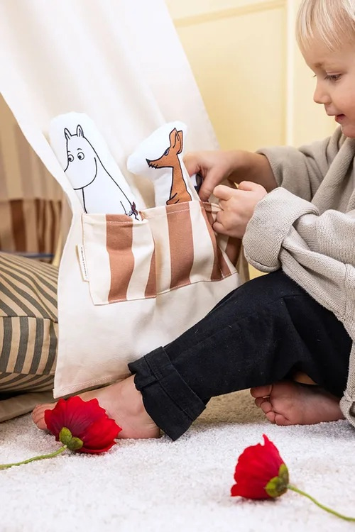 Namiot Muminków wykonany jest z wytrzymałego płótna z certyfikowanej bawełny i drewnianych słupków z certyfikatem FSC. Drzwi mogą być „zawsze otwarte” dzięki uchwytom na zasłony po obu stronach drzwi. Na książki i zabawki, które chcesz zabrać do namiotu, znajdują się dwie wewnętrzne kieszenie. Na zewnątrz znajduje się mniejsza kieszeń, w której znajdziesz trzy małe tekstylne figurki Muminków: Mamma Muminka, Mała Mi i Sniff.