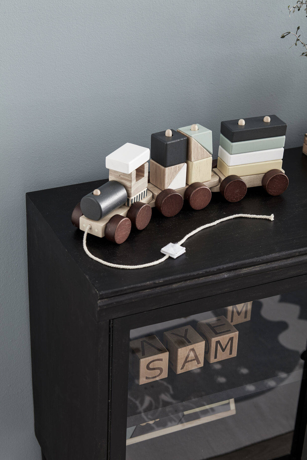 • Drewniany pociąg do ciągnięcia z serii NEO, z elementami malowanymi oraz w kolorze naturalnego drewna.
